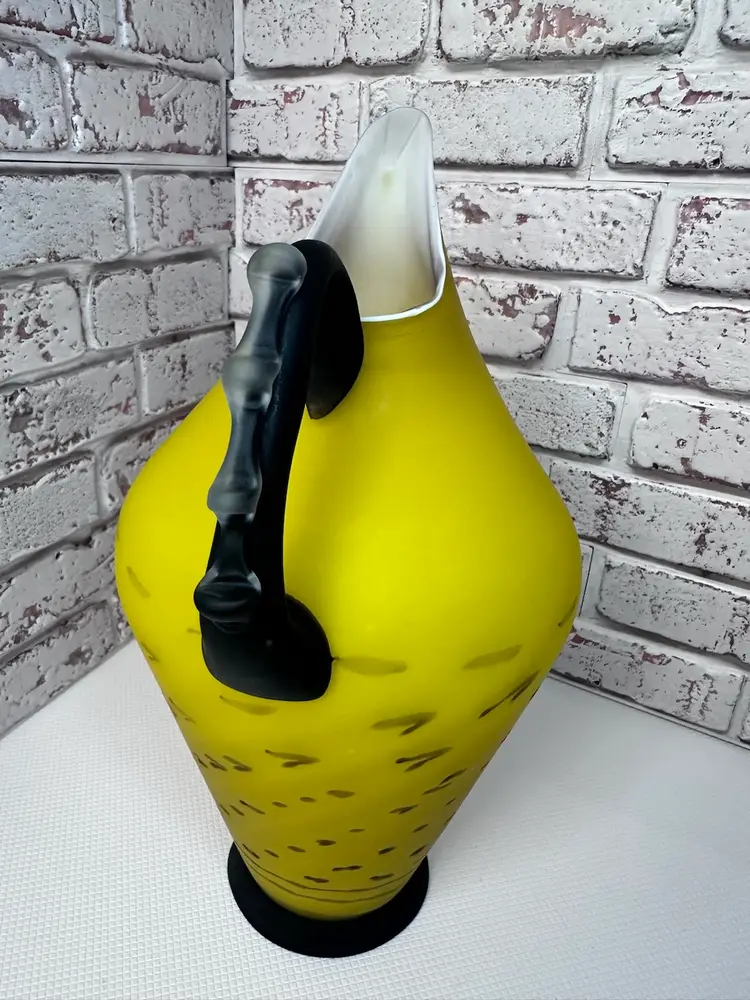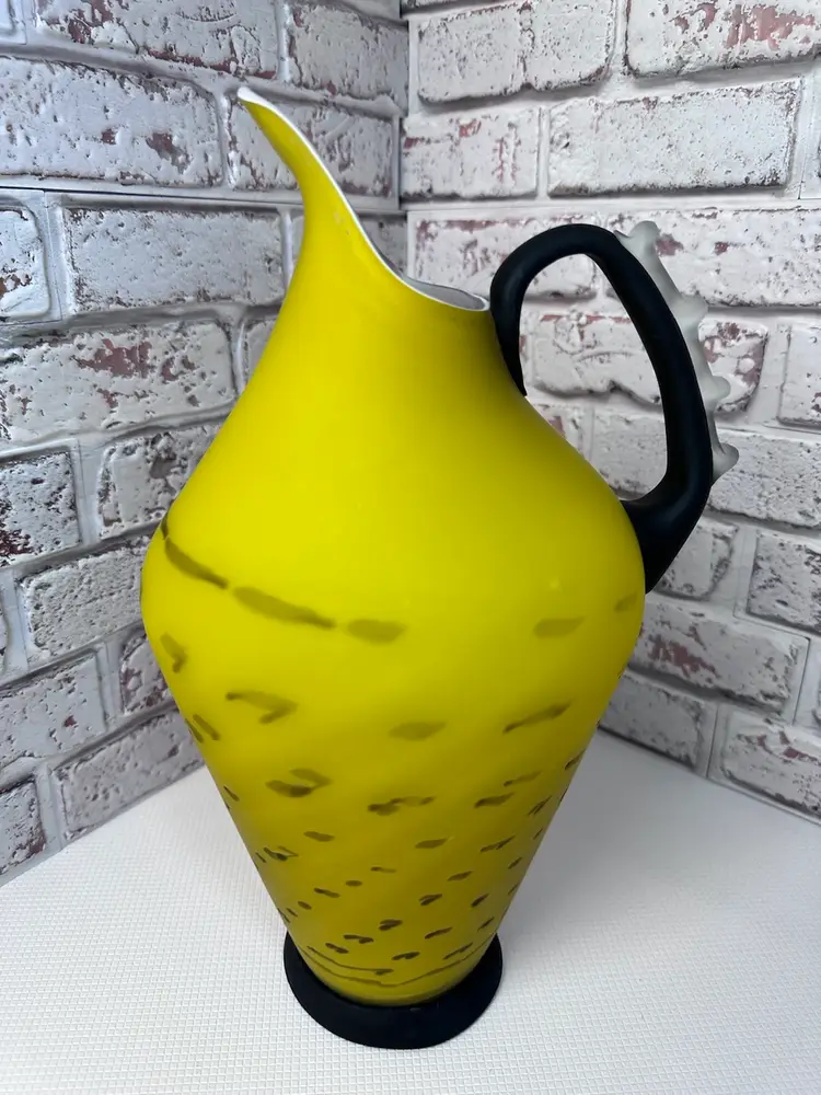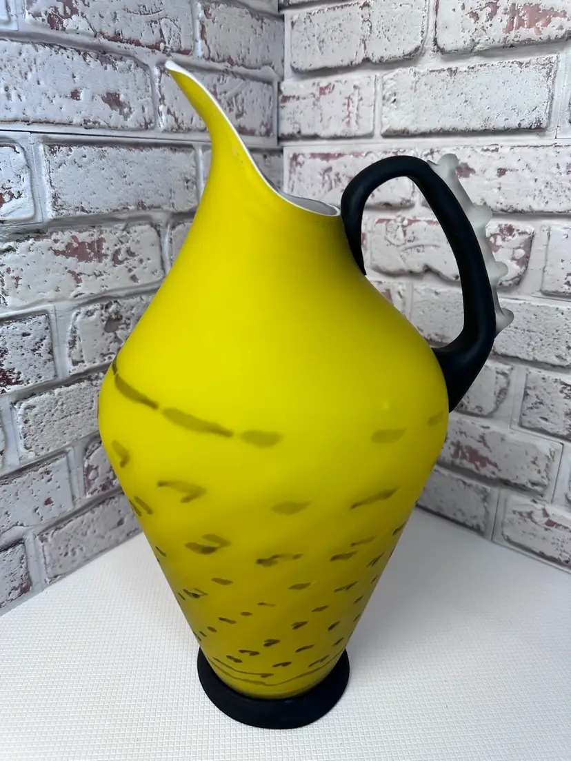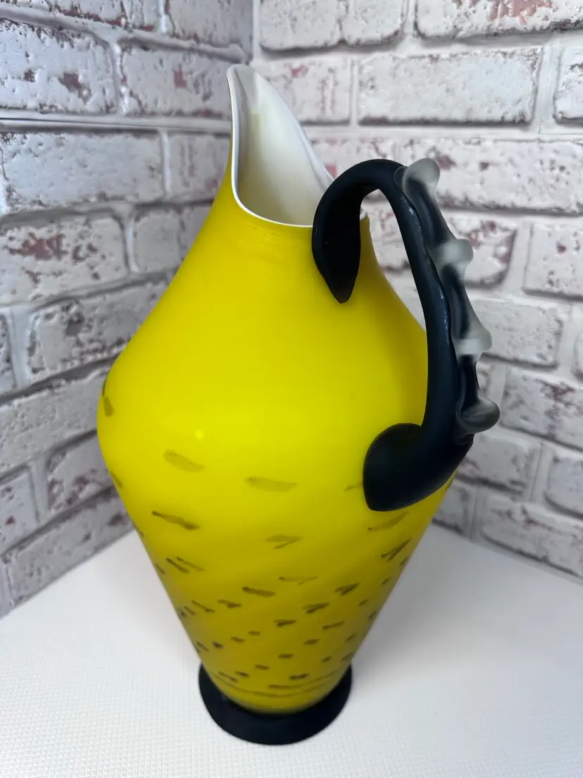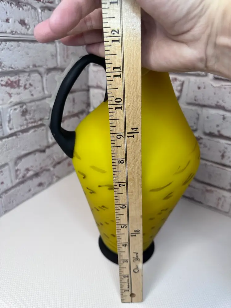 No chips or cracks or breaks it is perfect, but some marks and I see one bubble it is forgivable. And it is a Matt of coloring of yellow and black handle with clear fractured bumps on it. And bottom black is. Measuring 13.5 tall mouth is almost 4” wide. Pitcher And Kitchen Or To Display It When You Have Company Over 13.5 ” Tall