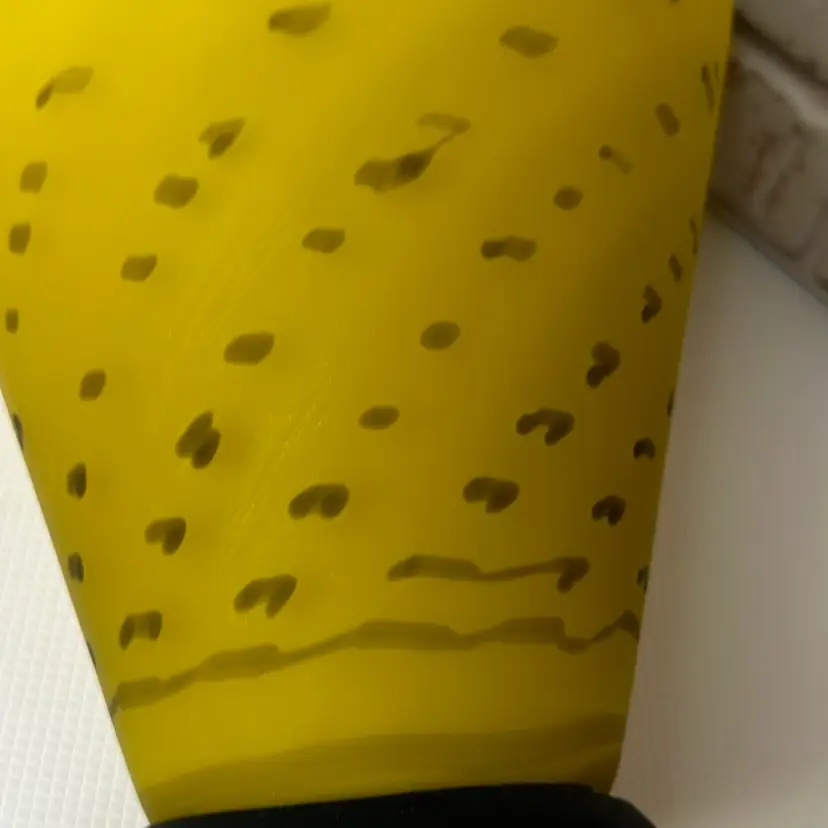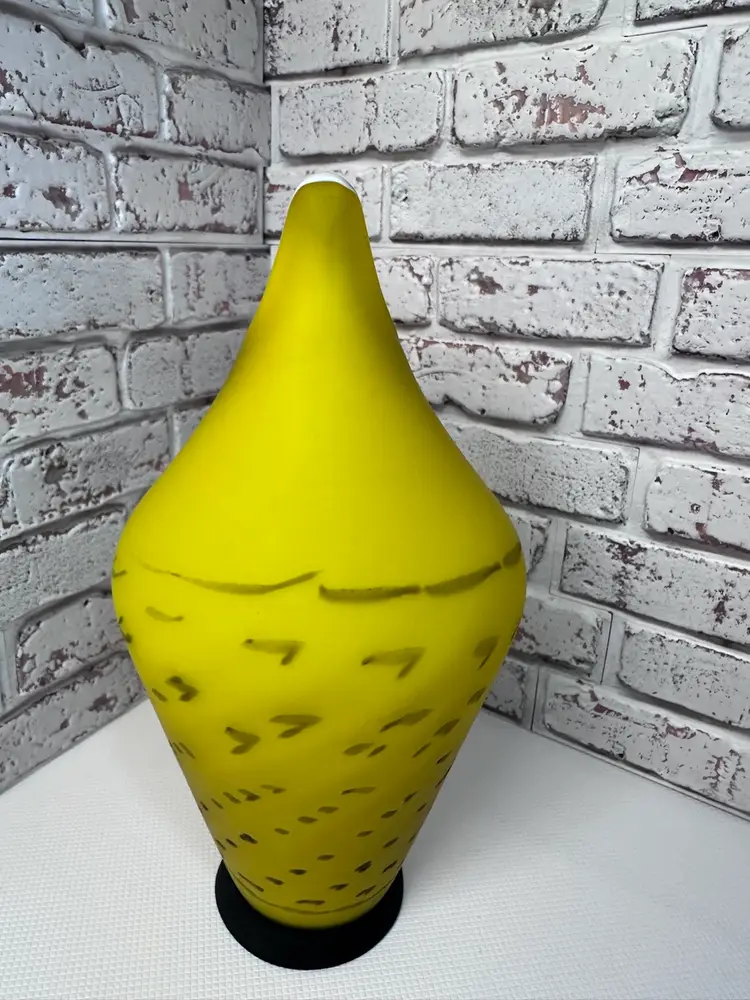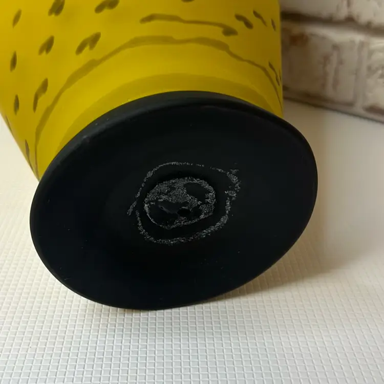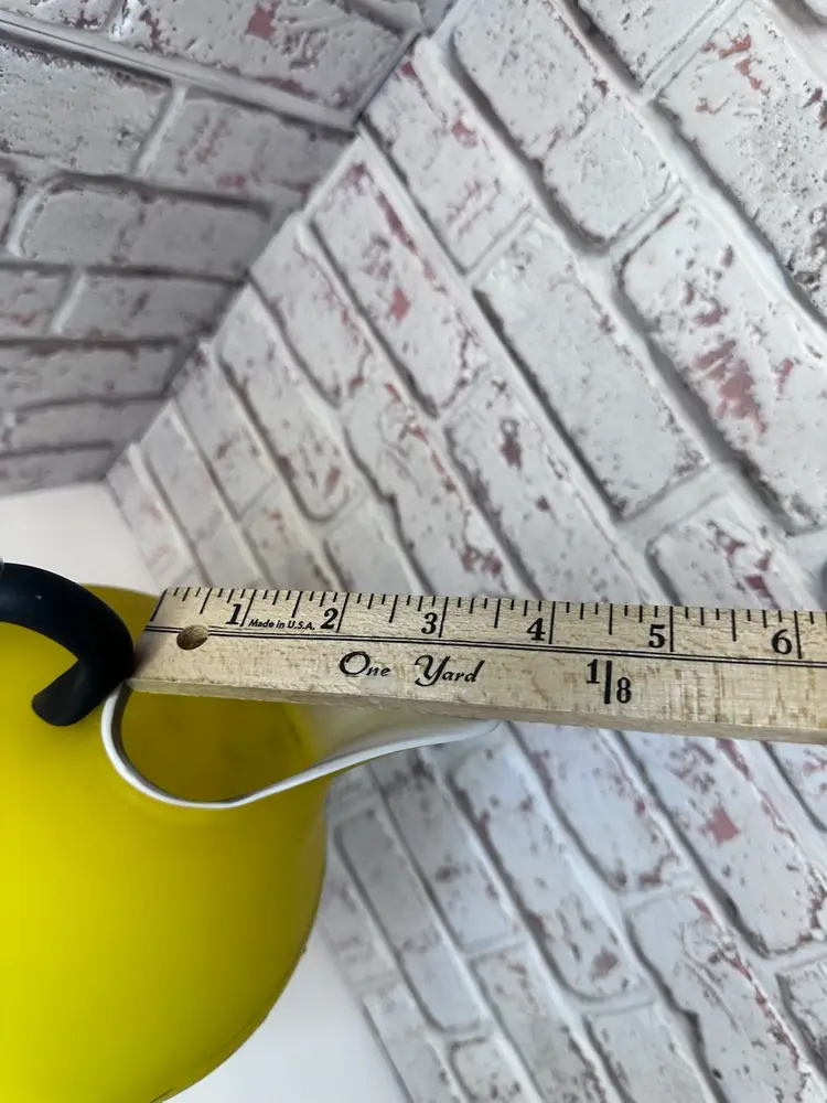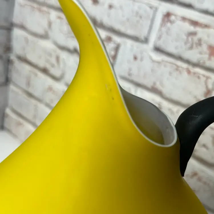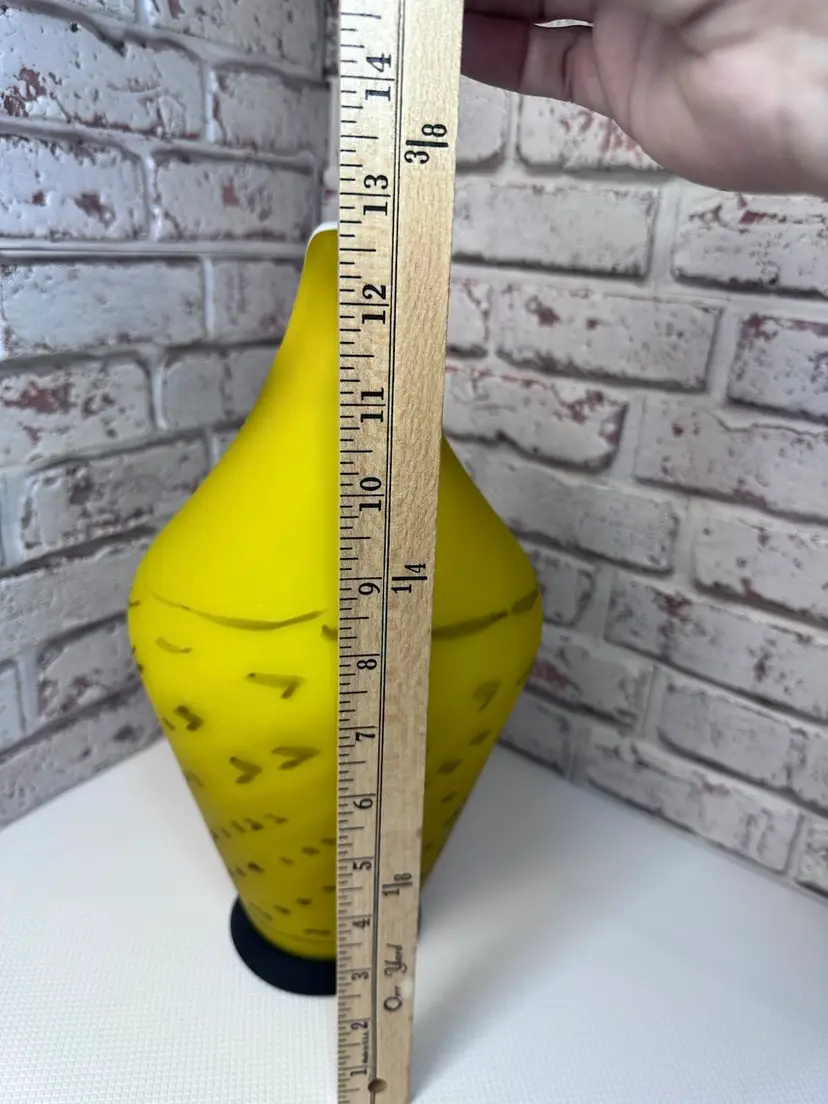 No chips or cracks or breaks it is perfect, but some marks and I see one bubble it is forgivable. And it is a Matt of coloring of yellow and black handle with clear fractured bumps on it. And bottom black is. Measuring 13.5 tall mouth is almost 4” wide. Pitcher And Kitchen Or To Display It When You Have Company Over 13.5 ” Tall