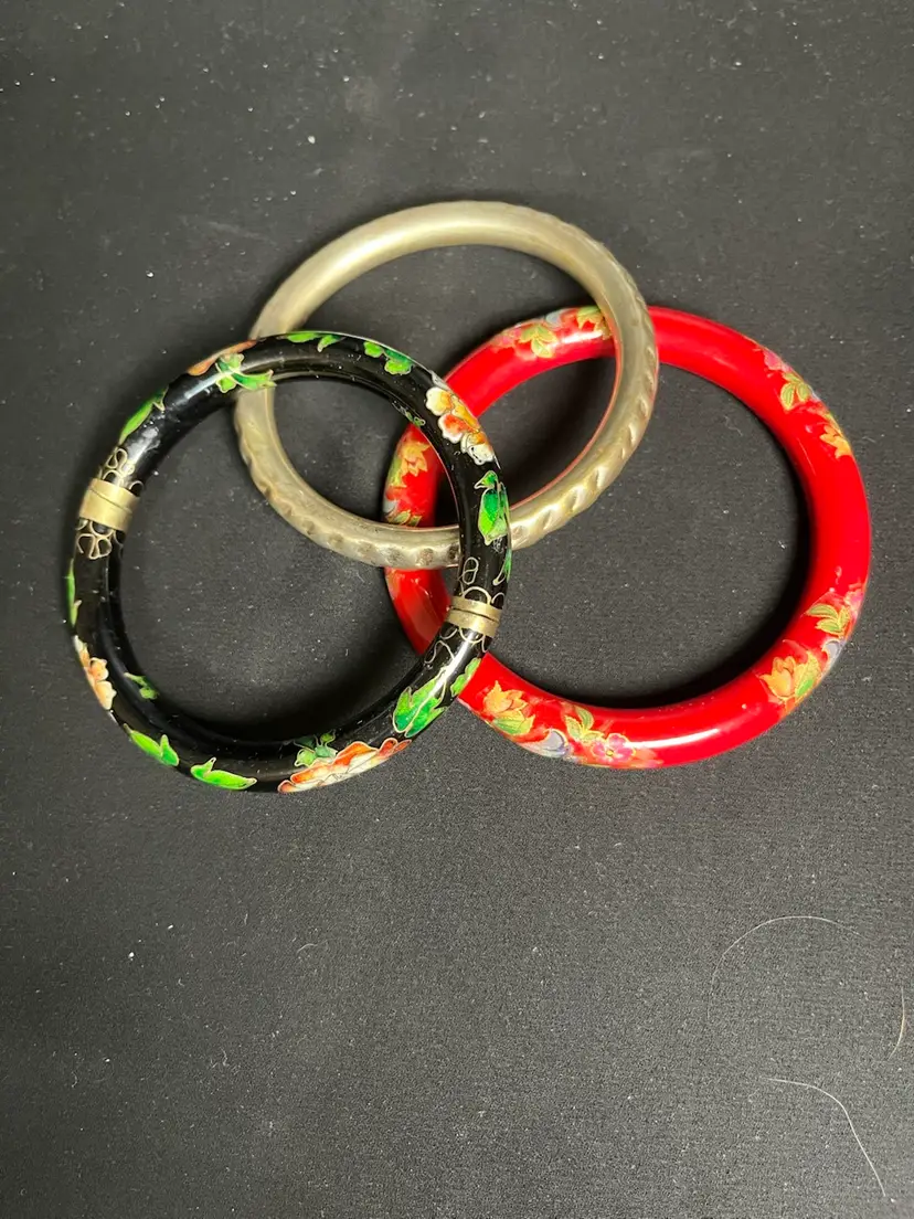 #01 2 Colorful Cloisonne Bracelet & 1 Textured Silvered Toned Bracelet
