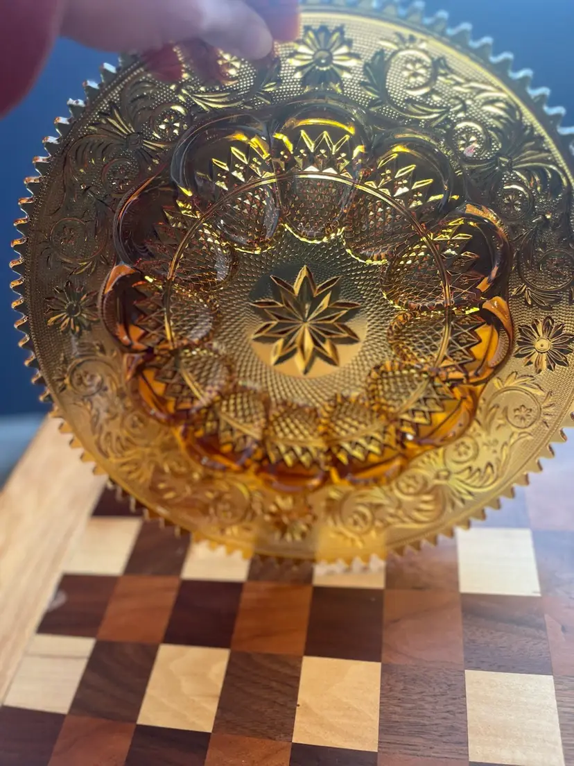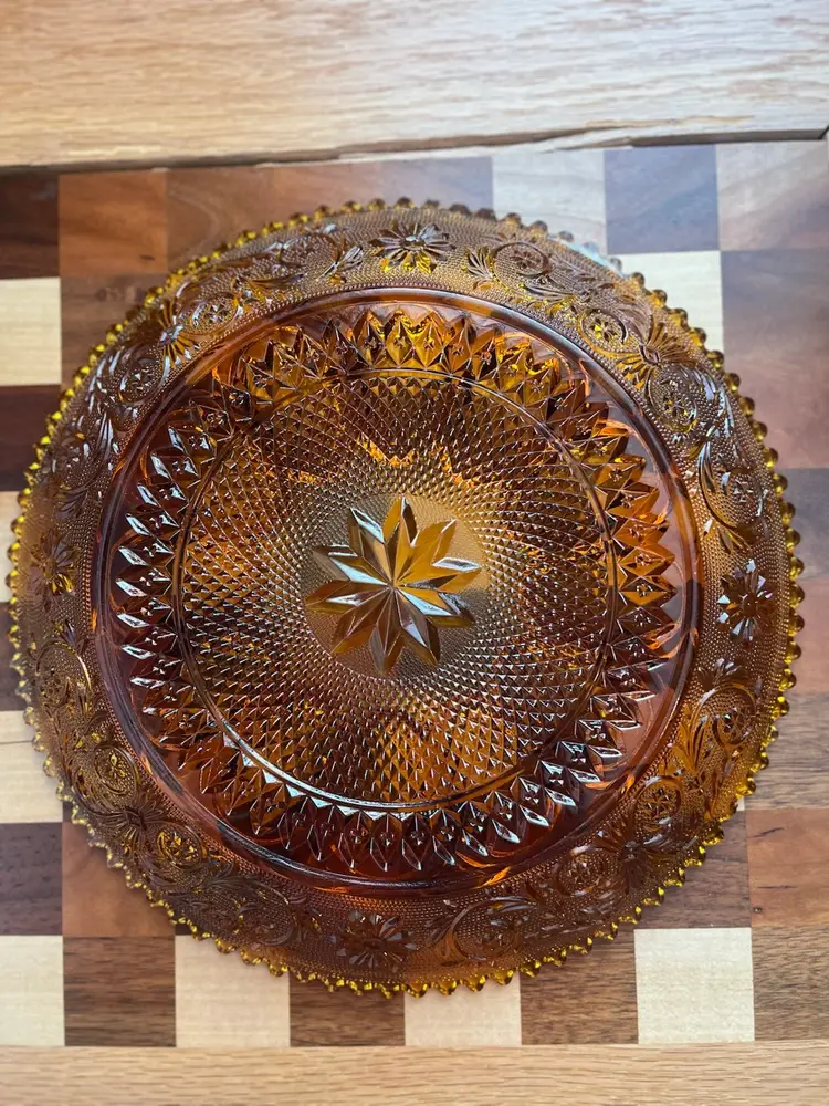 Deviled egg platters, like this one, gained popularity in the mid-20th century as entertaining at home became more common. The amber glass, reminiscent of earlier carnival glass, provided a warm, inviting aesthetic. Pieces like this Indiana Glass Tiara platter are sought after by collectors for their nostalgic appeal and the detailed craftsmanship of American pressed glass.