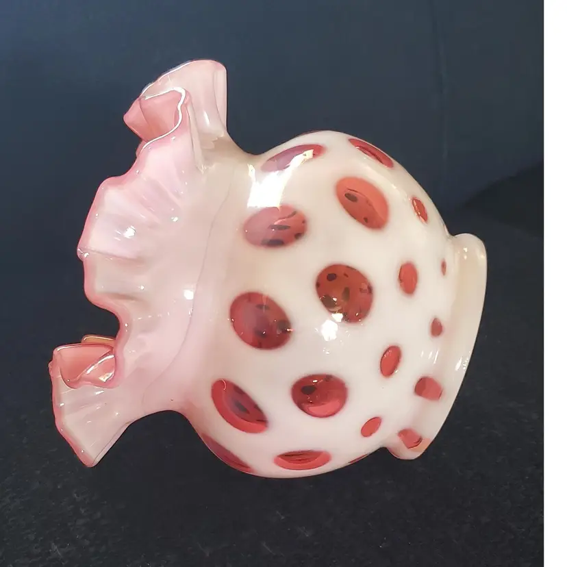 Beautiful opalescent glass vase in a gorgeous cranberry pink color. Pre logo Era. Unmarked. Stands 5" high. 6" wide at top of ruffle and 3 1/4" at base. In perfect condition.