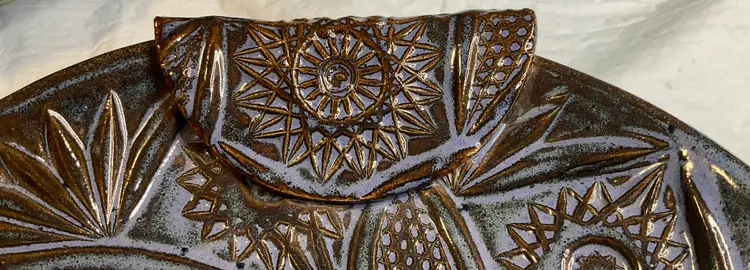 #01 Handmade pottery plate, 10” round, beautiful bluish purple glaze, with a unique folded piece that adds a wonderful touch. Initialed with JS 14