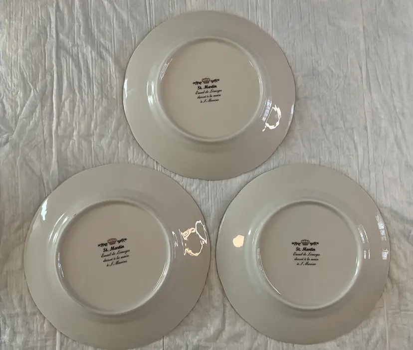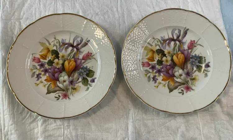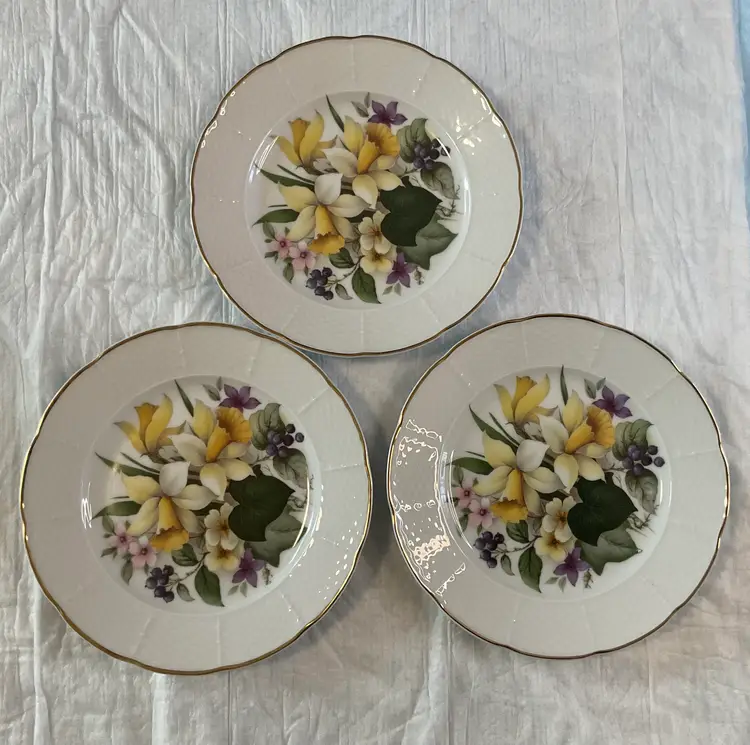 3 plates with yellow daffodils, 2 plates with crocus and iris, and 1 plate with iris and pansies.