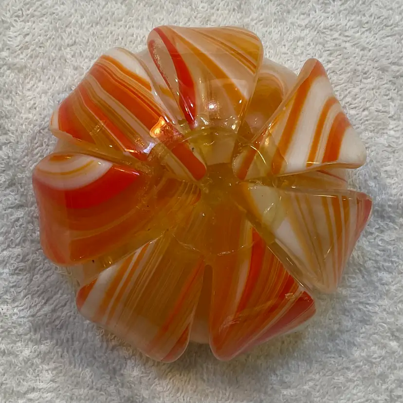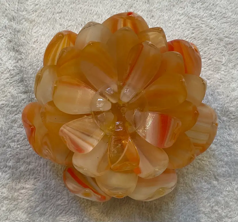 This has been created by cutting each petal and heating them to bend into flower petal shapes. There are four layers each having 7 petals and graduating smaller to the inside. Each layers appears to be help together by a plexiglass disc.