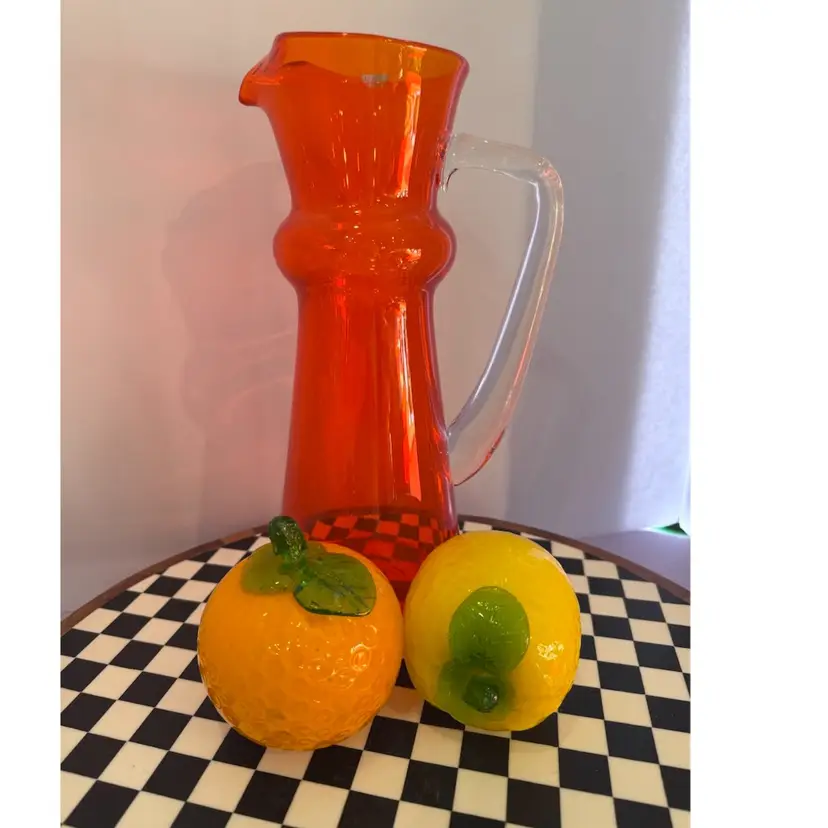 Krosno MCM style bright orange glass pitcher with clear applied handle. Made in Poland. Excellent condition. Still has sticker. Measures about 11 1/2 inches tall. Awesome glass lemon and glass orange.