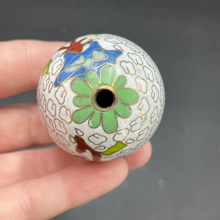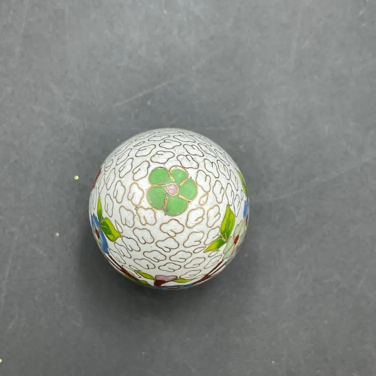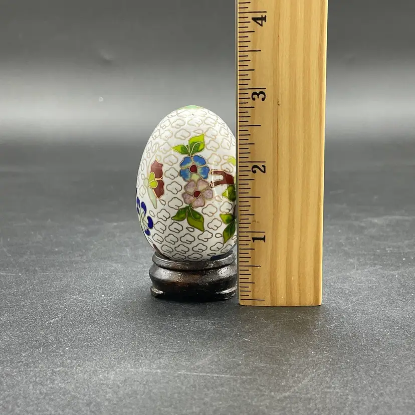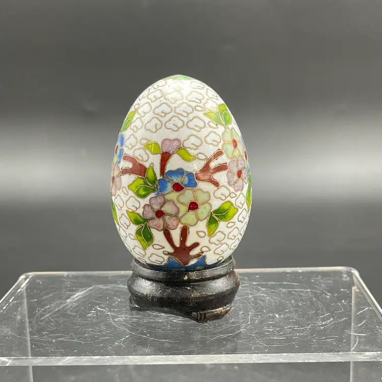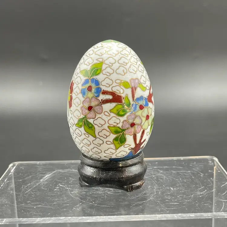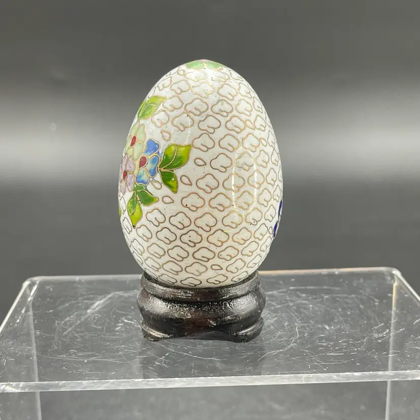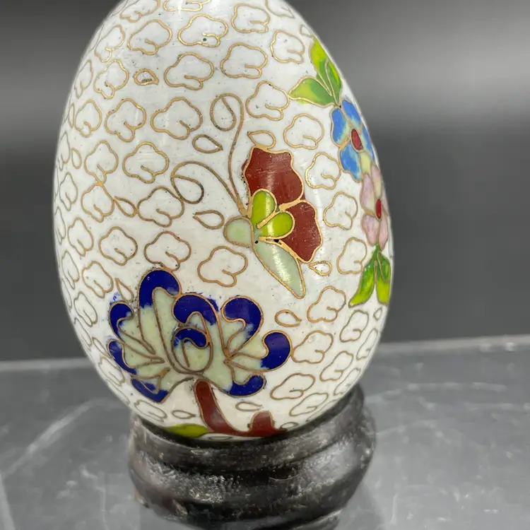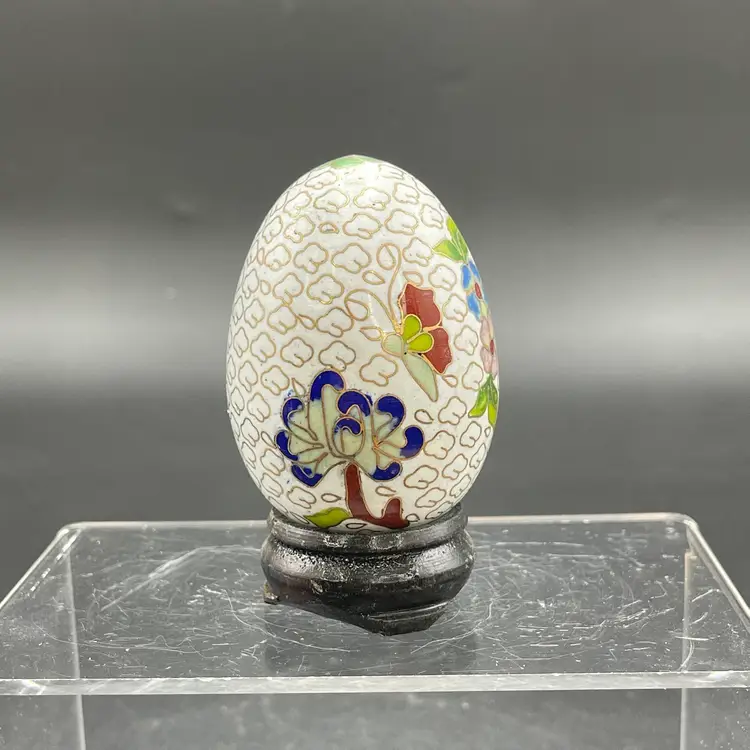 This is a vintage white enamel cloisonné egg in a butterfly and floral pattern with a wooden stand. Measures approximately 2.5" tall including stand. No major flaws.