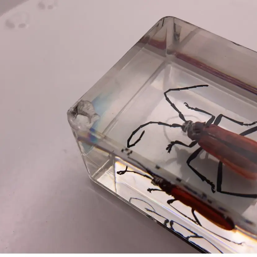 They are new in plastic but the lucite has some chips, one large chip on the left beetle.
