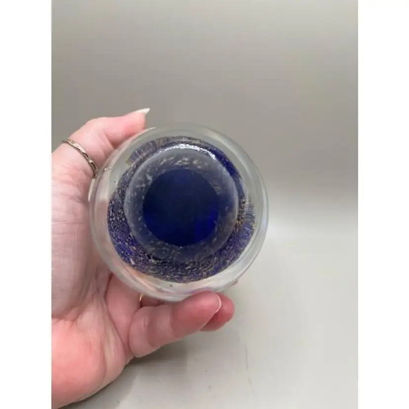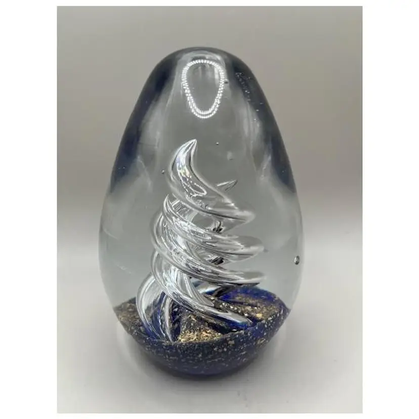 This stunning glass paperweight features an elegant swirl design with shimmering gold flecks at the base. Perfect for adding a touch of sophistication to your desk or shelf, it's a beautiful piece for any glass art enthusiast. In excellent condition with no chips or cracks.