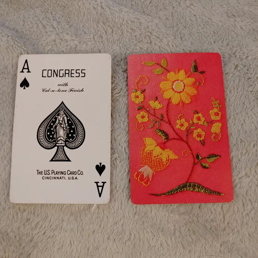 1 Single Swap Card - Playing Card. Vintage stitched floral card. Pink background with yellow and green flowers. Ace of Spades. Congress. Made in OH. Dimension 2.5 x 3.5. Read description.