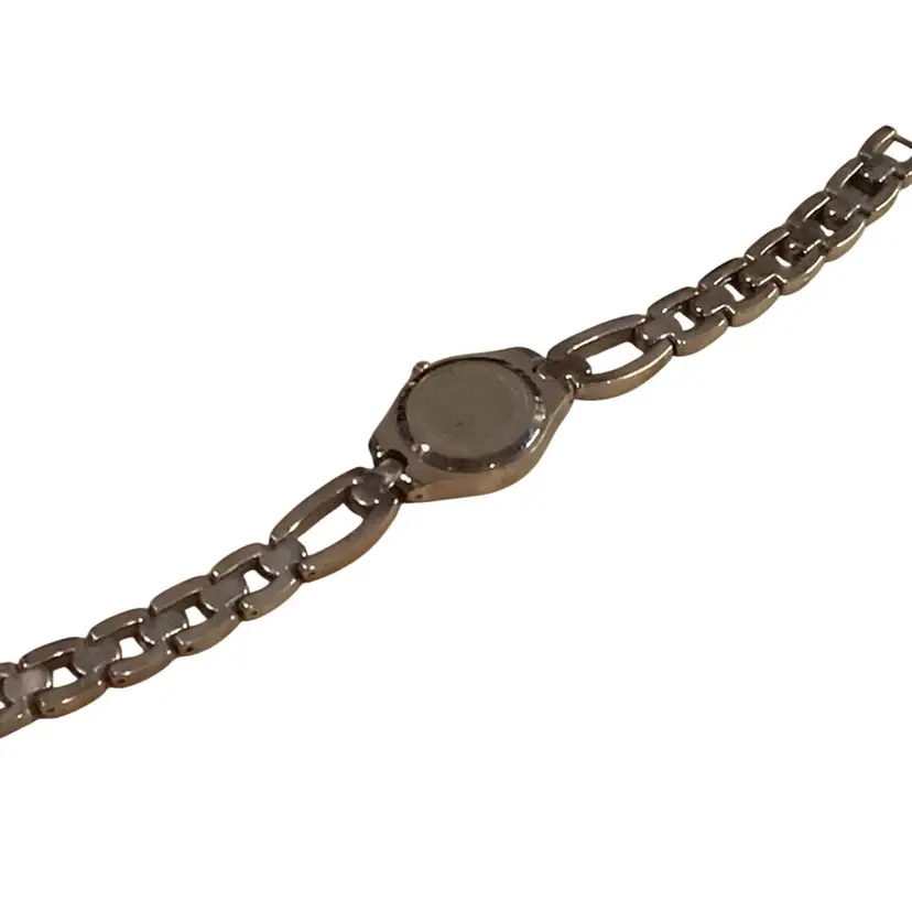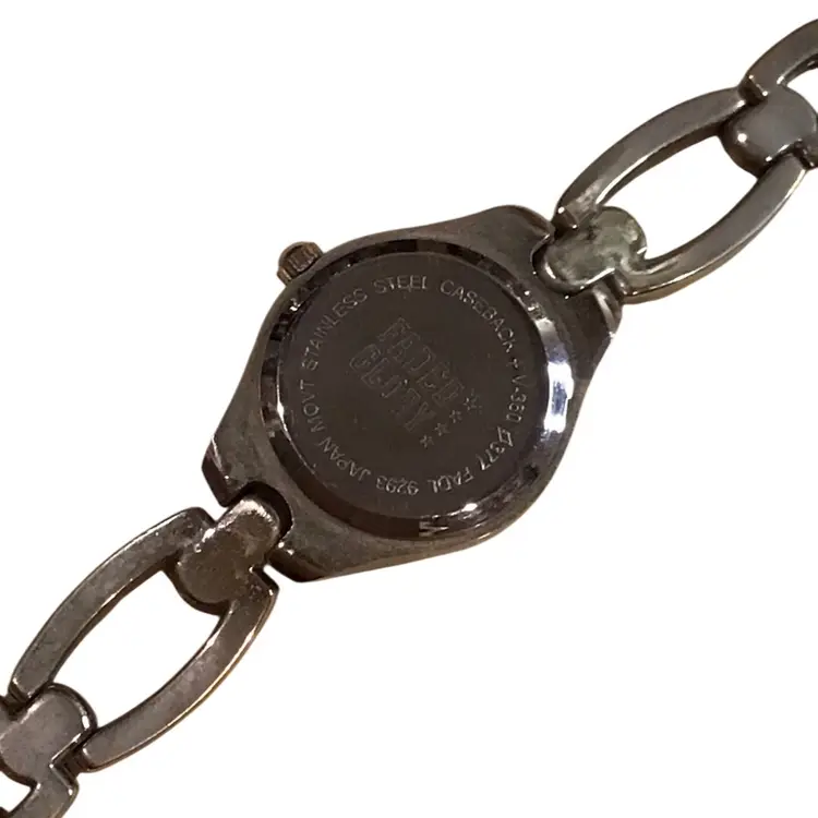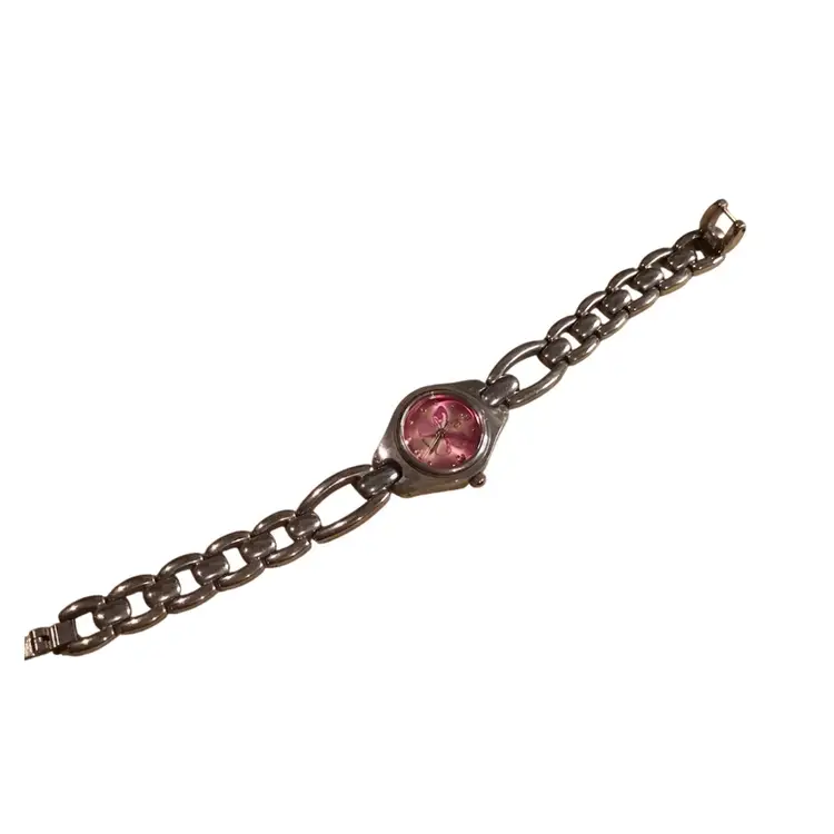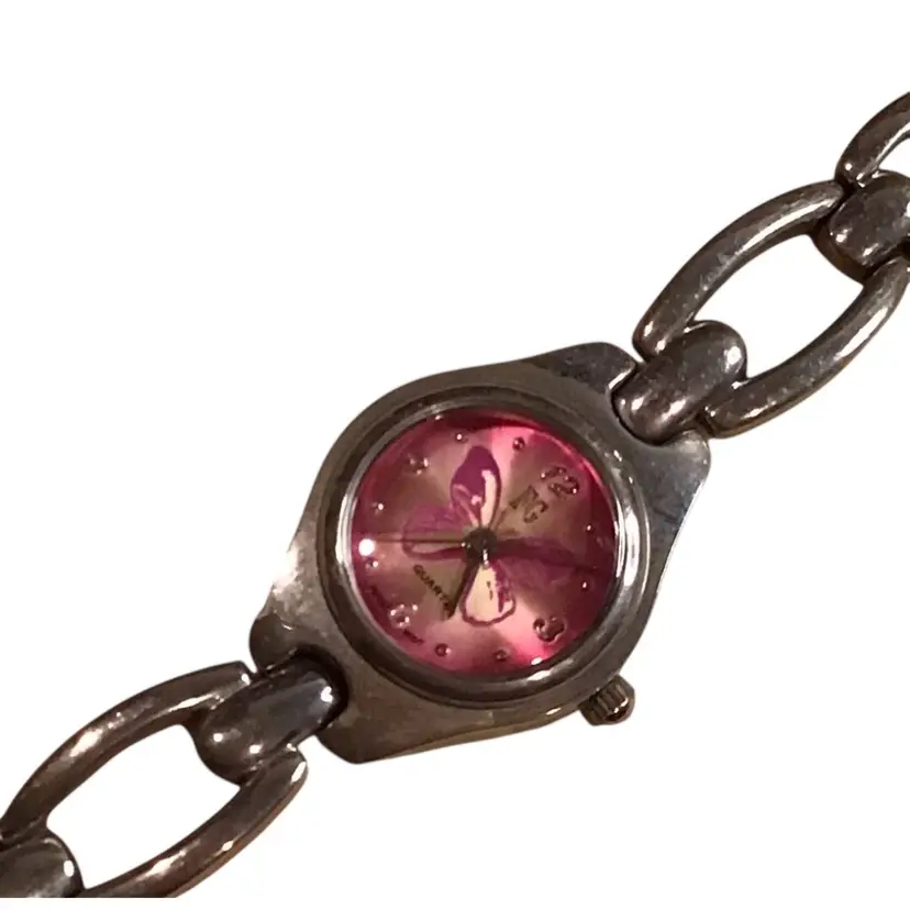 a Faded Glory women's watch with a butterfly-themed pink dial and features a silver-tone metal bracelet band with linked sections.