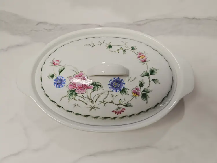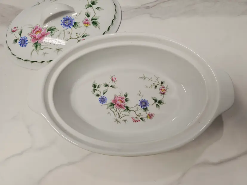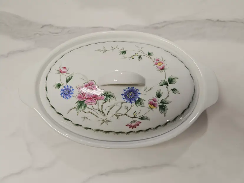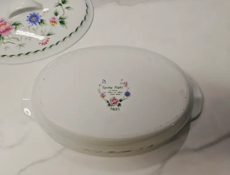 Description: This 1 Pt Oval Covered Casserole from Sadek’s Spring Night pattern features a lively arrangement of pink, blue, and red florals dancing across a crisp white porcelain surface. A soft green vine border encircles the lid, adding a touch of garden elegance to its vintage silhouette. Perfect for serving or display, it brings a cheerful, cottagecore charm to any table. Many pieces are sold under the brand name "Andrea by Sadek," and you may see either Andrea or Sadek on the base; Andrea by Sadek is the brand used for the company’s decorative lines while Sadek can appear as the maker’s mark on items they produced or distributed. Made by: Sadek Pattern: Spring Night (Discontinued) Place of Origin: Japan Type of China: 1 pint Casserole dish with lid Measurement: Length: 9 5/8 in, Height: 3 1/2 in Markings: SEE PIC Condition: Used, Good Condition SOLD AS IS NO RETURNS Shipping: Most Mondays, Wednesdays & Fridays SKU:250828M