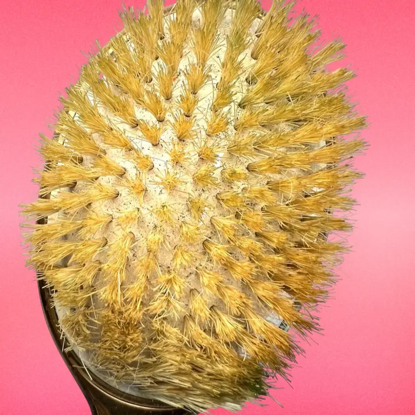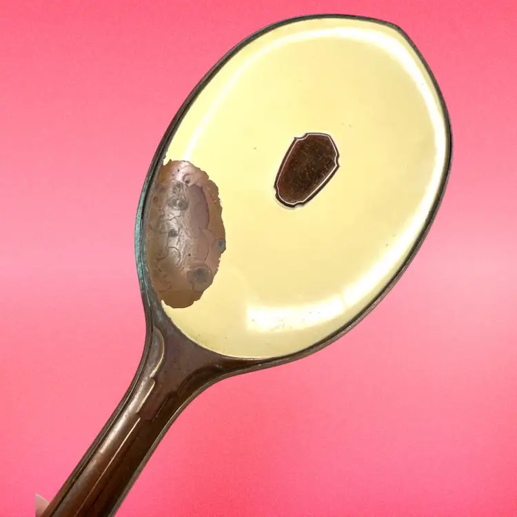 Vintage Art Deco Style Brush- Ivory color with Copper Medallion Size 10-3/8” x 3-1/8” x 1” Weighs 6 ounces Condition: Heavy patina on handle & edges with a couple of green (copper patina) areas; part of back peeled off; bristles may come out if handled roughly