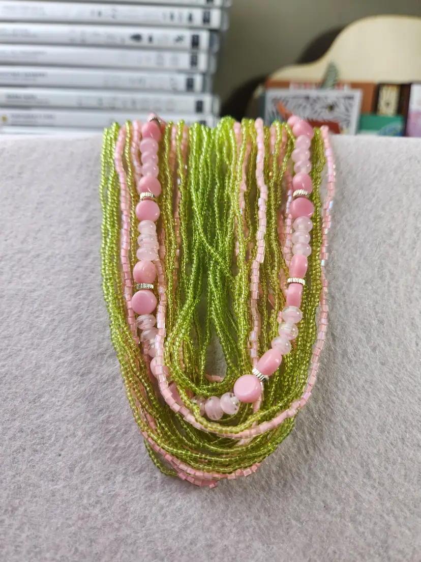 This necklace came out of my mother-in-laws jewelry collection. The green and and pink seed bead necklace was the first piece of jewelry she ever purchased for herself in the 1960's. 14" long, very delicate. Some verdigris on the wire.