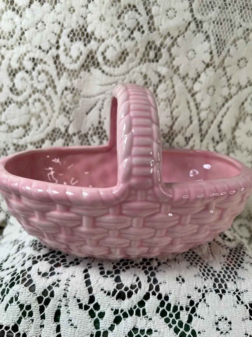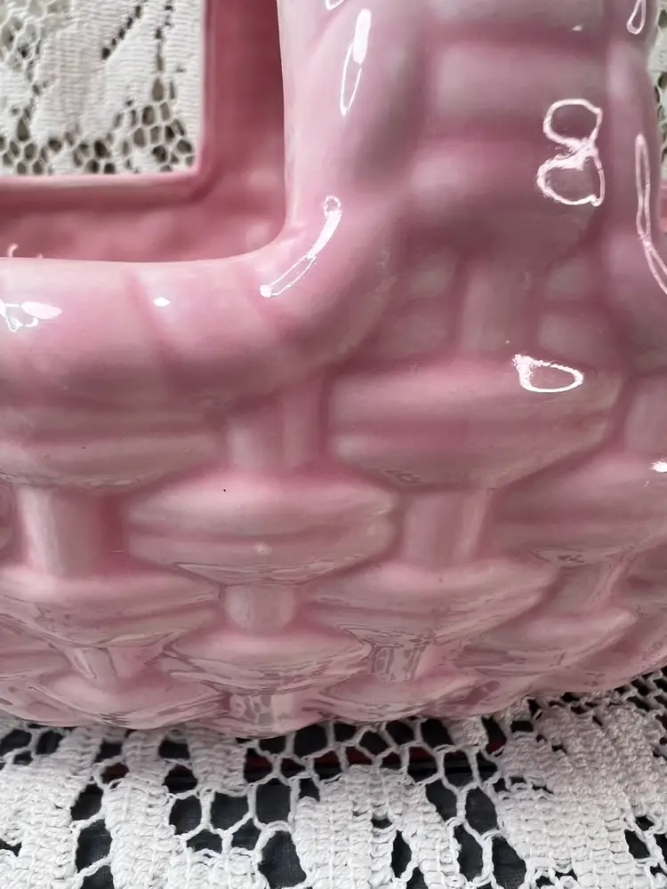 110 Pink Ceramic Woven Easter Basket 1981, Signed H A 9" X 6.5" X 6"