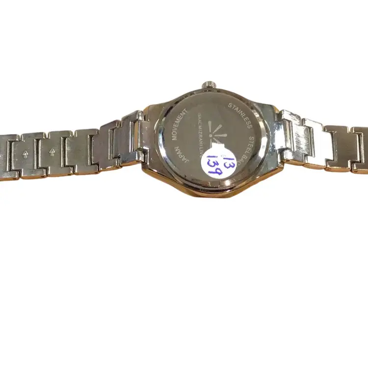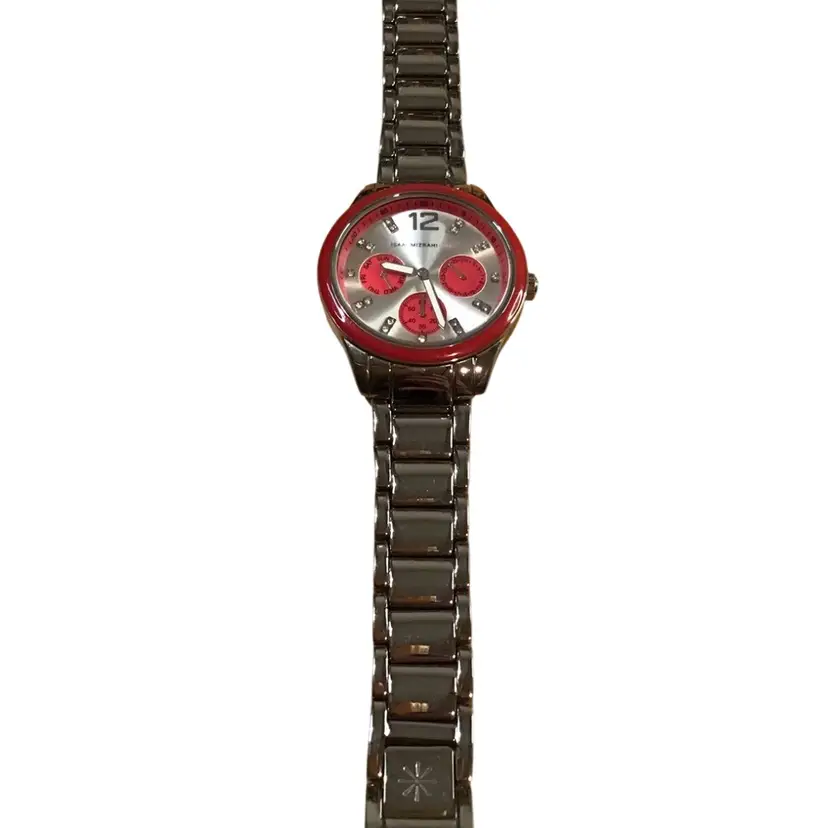 This is an Isaac Mizrahi Live! day and date watch with a silver-tone band and red bezel. Extender link is included