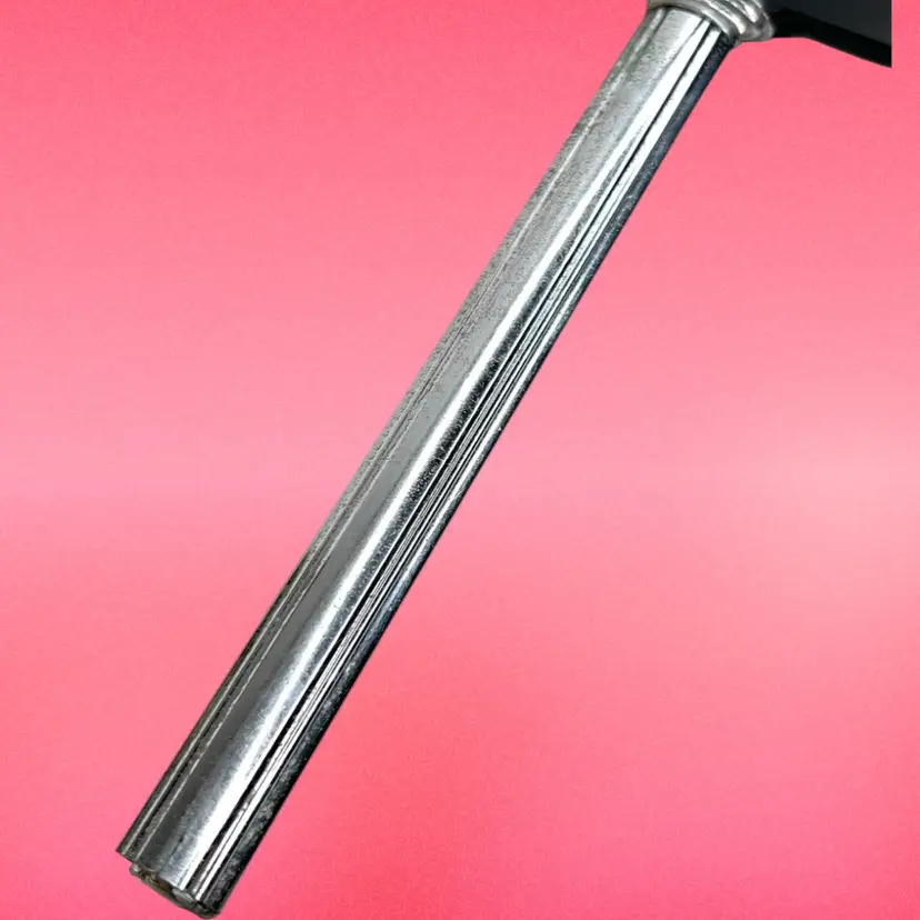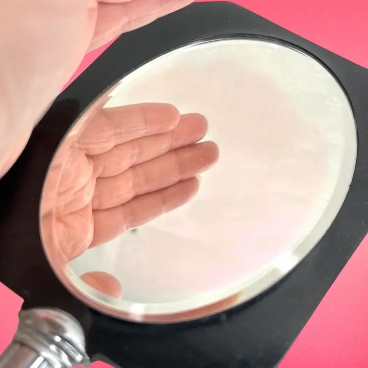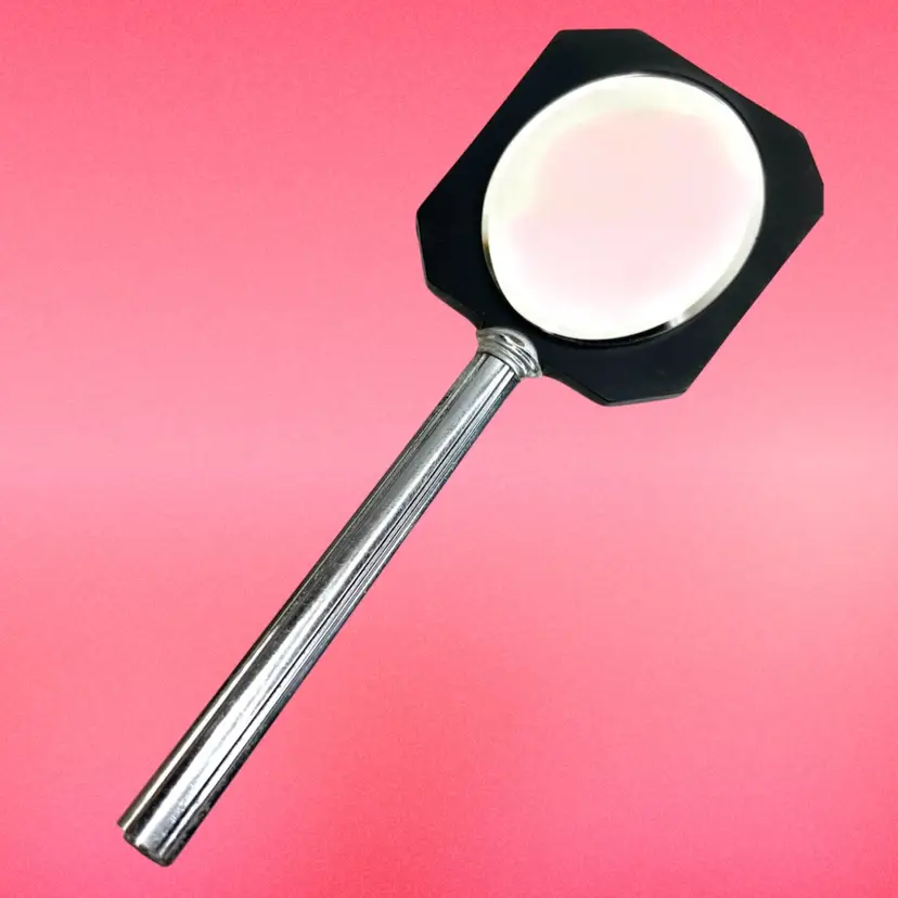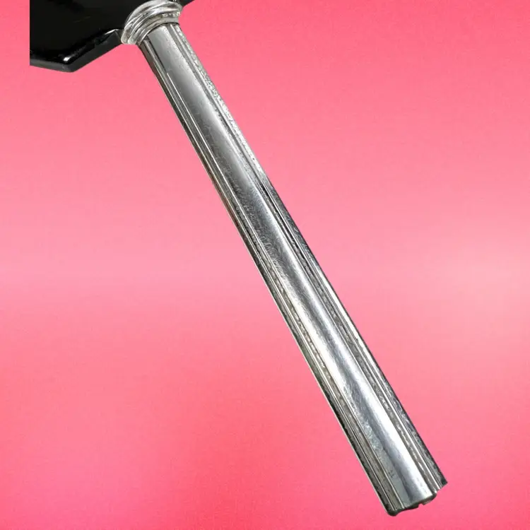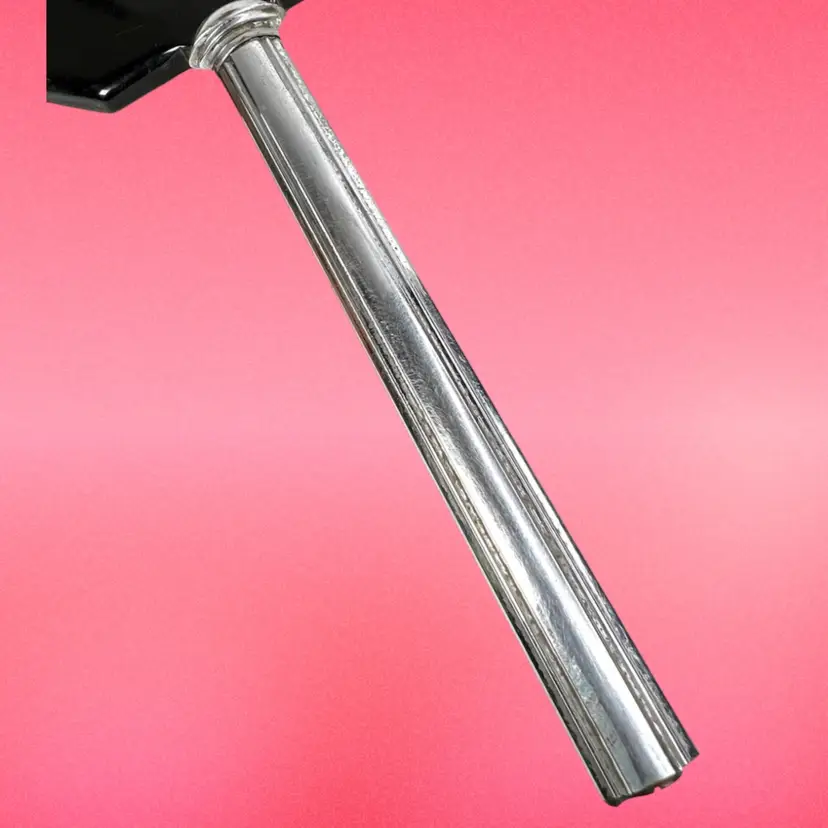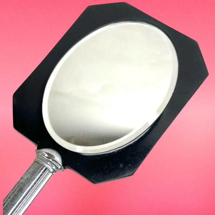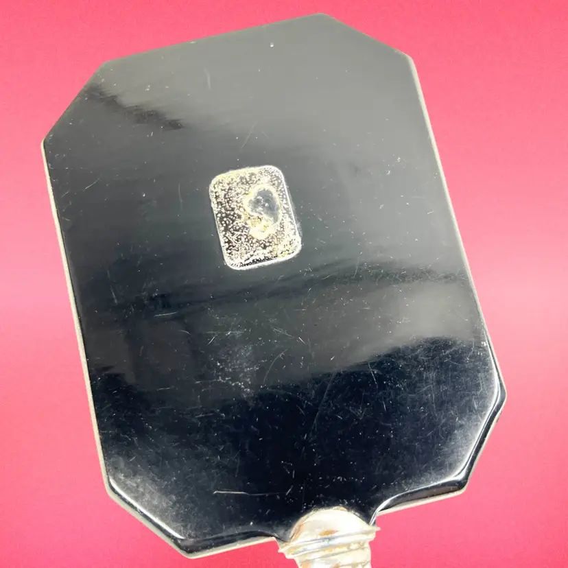Vintage Art Deco Style Handheld Vanity Mirror 13” L x 4-7/8” W x 5/16” D Weighs 9 ounces Black Back- Material is Plastic; Missing Center Medallion Silver Plated Handle- Tested as Low Grade Silver (magnetic so has a ferrous iron base metal); Missing End Cap; Patina on Handle from years of use Mirror- Clear & Reflective Minor scratches from use One “burn” spot on edge