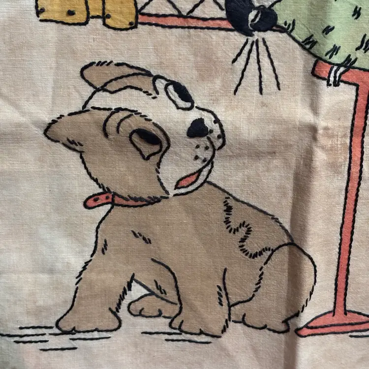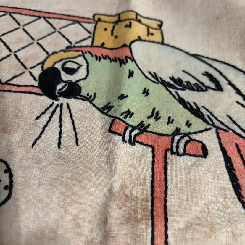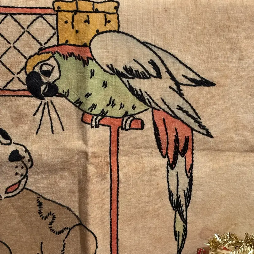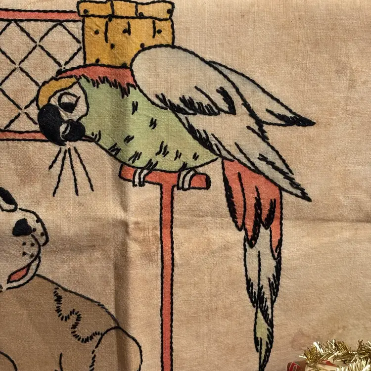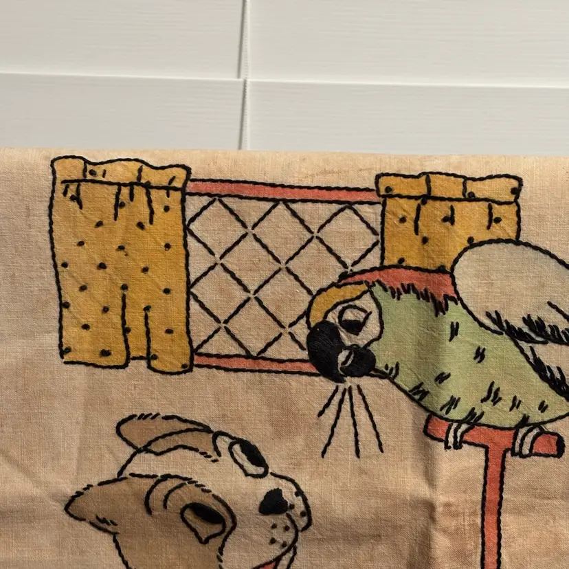 Vintage pillow cover with appliqué and embroidery. Doodle dog and parrot. Exquisitely done. As you can see the fabric discolored and stained due to age. Adds to the aesthetics. I did not wash it due to fear of embroidery thread bleeding. The fabric is still in great shape, no rips, tears. 109% cotton. Measures14”x14”. Cans be used for pillow cover or framed.