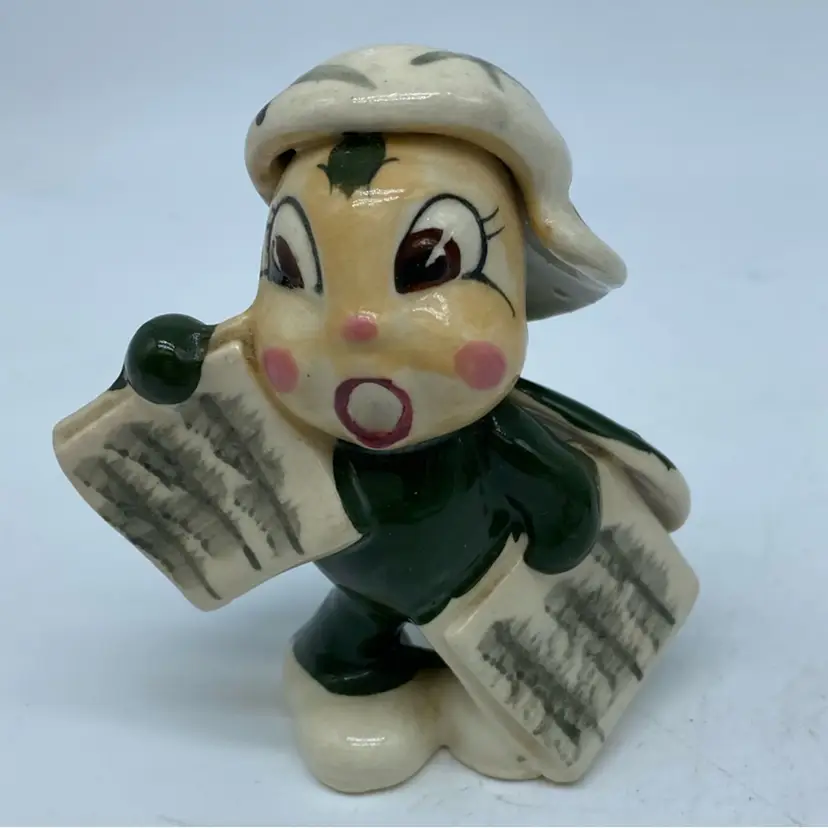 This particular figurine, likely a "newsie" bug, represents a common theme of the era, combining cute characters with everyday roles. Such figurines were often sold in novelty shops and department stores, serving as affordable decorative items or small gifts. Their enduring appeal lies in their nostalgic charm and the playful artistry evident in their design.