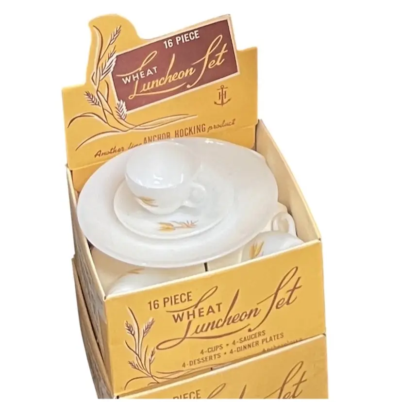 ๐4 Settings Per Box ๐Milk Glass Golden Wheat Pattern ๐Original Promotional Display Box ๐4-3.75" Tea Coffee Cups ๐4-6" Saucers ๐4-10" Plates ๐4 Dessert Bowls ๐Shipping Overages Refunded ๐No Chips or Cracks ๐ Review Photos for Best Condition Description ๐ Sold as Shown
