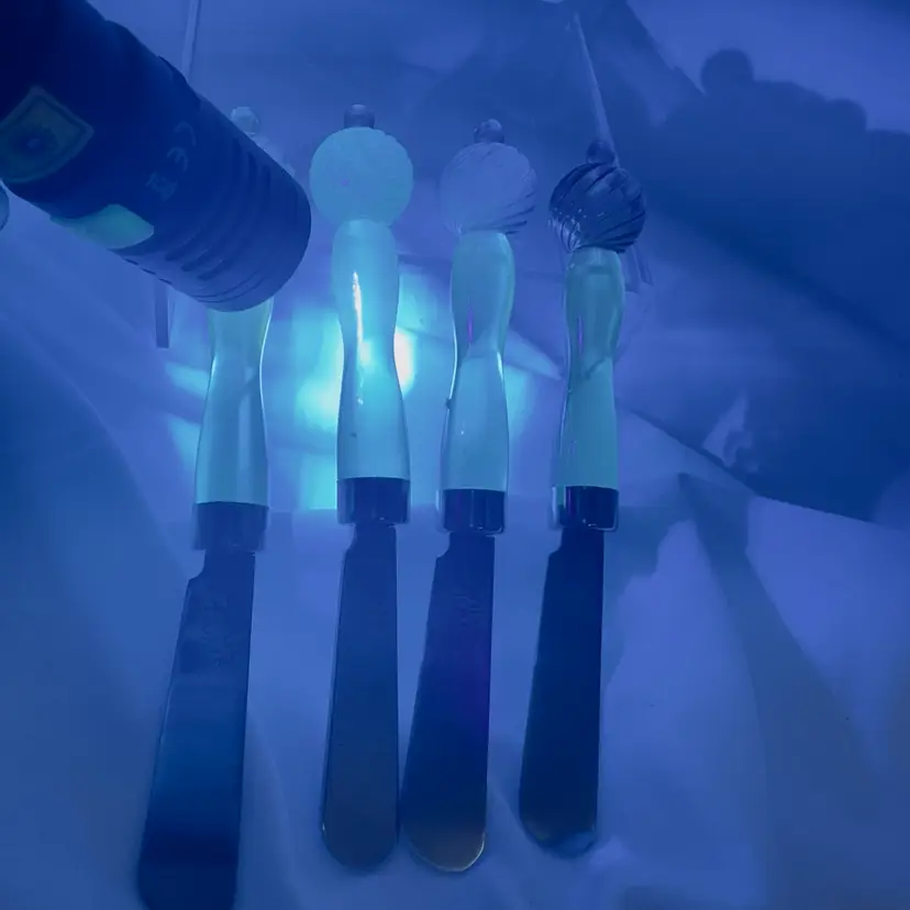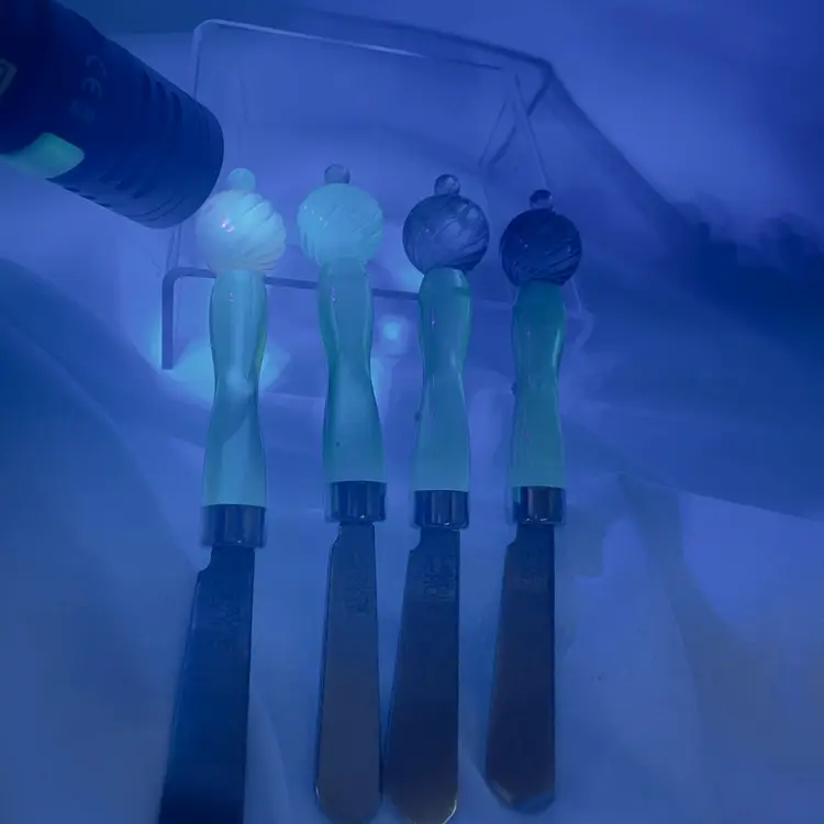 UV glow under blue light, purple, red, green and orange colored acrylic tops