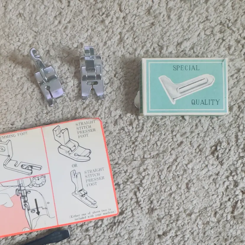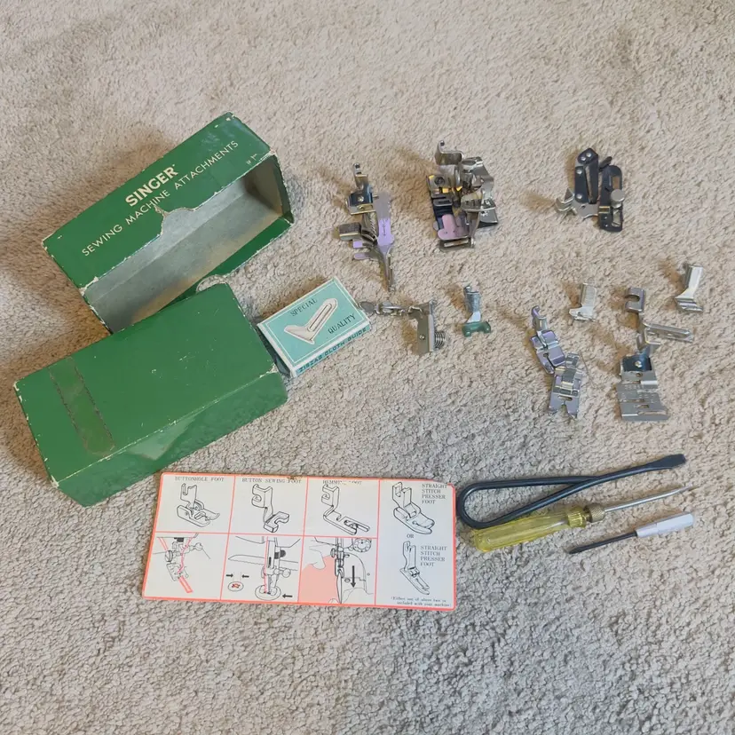 The box #160809-6 reg feet have no numbers-161127 Great Britain-36865 USA-160359USA-12055 USA Simanco-35931 Singer USA- 3 flat head screw drivers, the box and the instruction guide