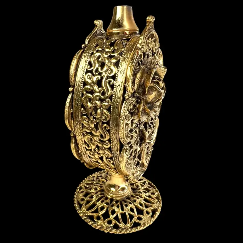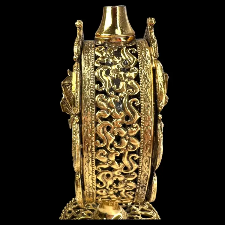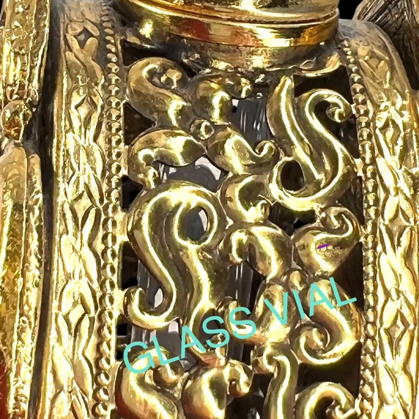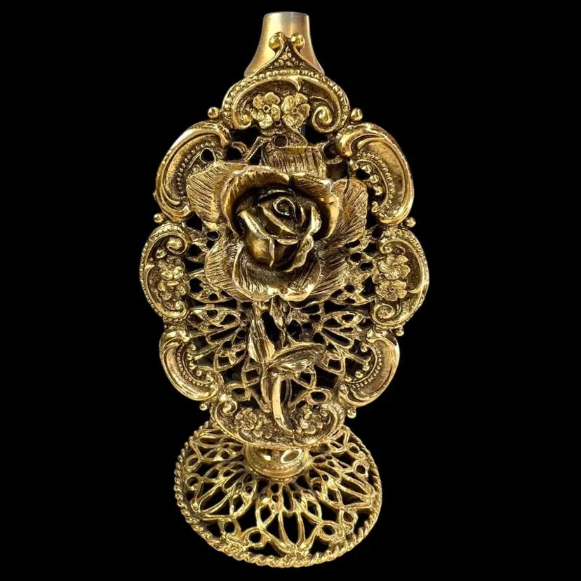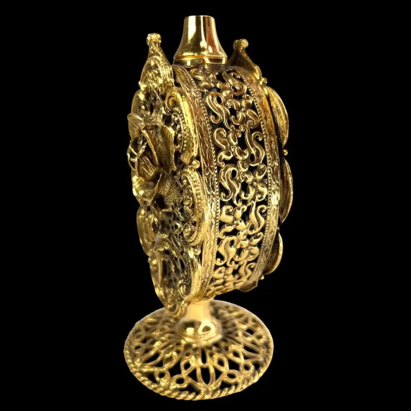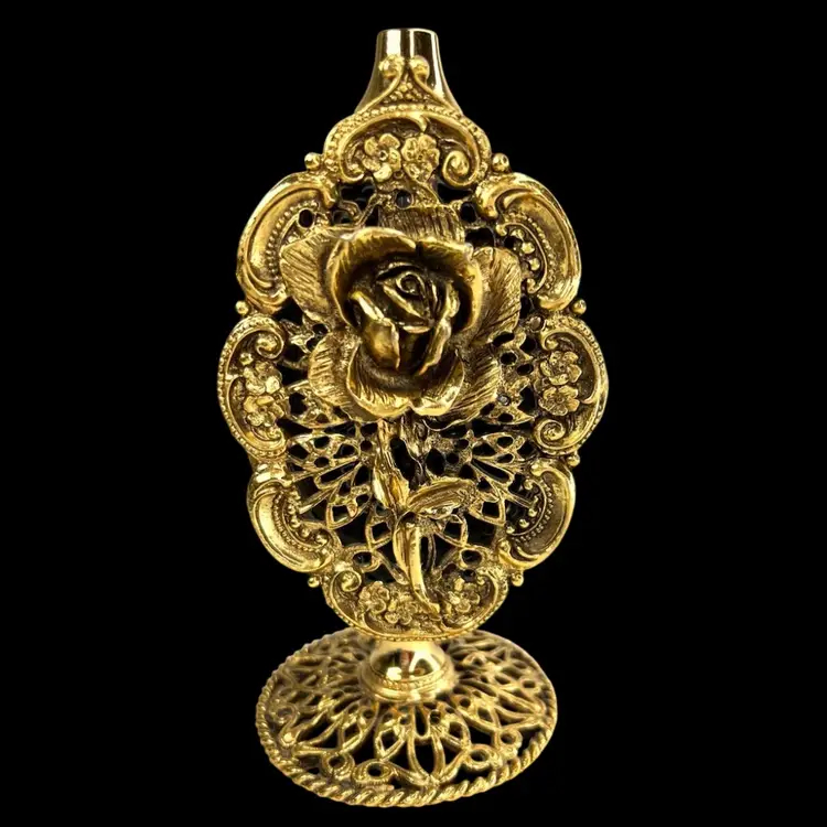 Incredible vanity piece! Unsigned, Vintage Rose Designs on Both Sides Glass vial intact inside (see last photo) No perfume dauber / dabber π’ Perfume Bottle in French Ormolu Technique - Ornate, Intricate, Gold Finishes, Heavy 18K Gold Gilded (acid tested) - Roses & Base & Front/Back. Non-magnet, so not a ferrous (iron) metal Sides too difficult to acid test but are magnetic, so they have a ferrous base metal. Weighs 14 ounces 6β H x 3β W x 3β D (base)