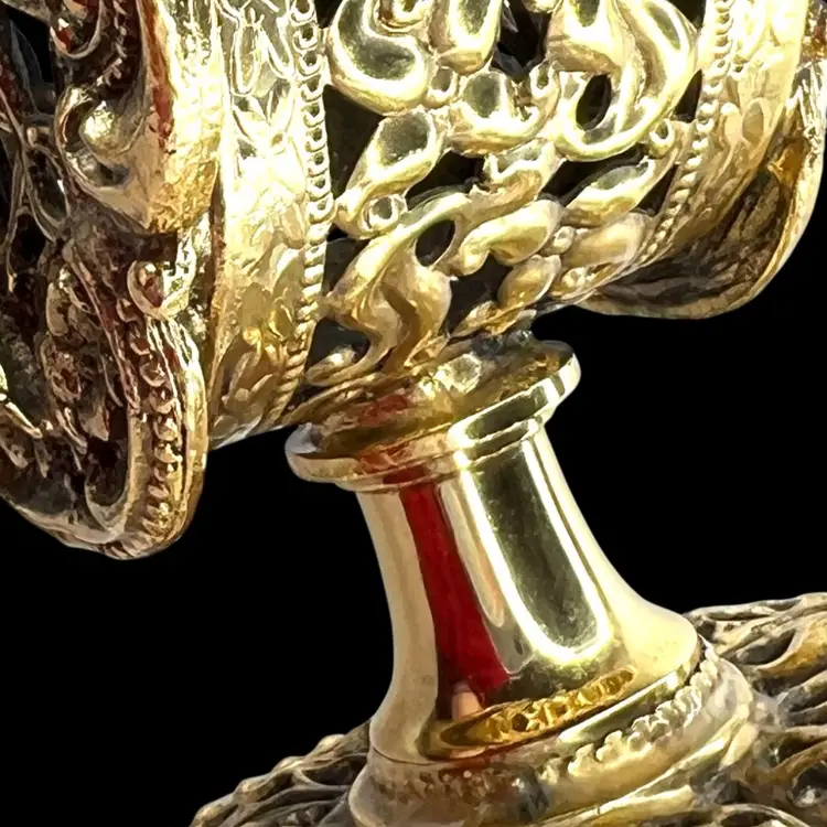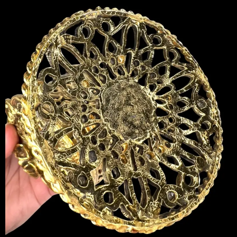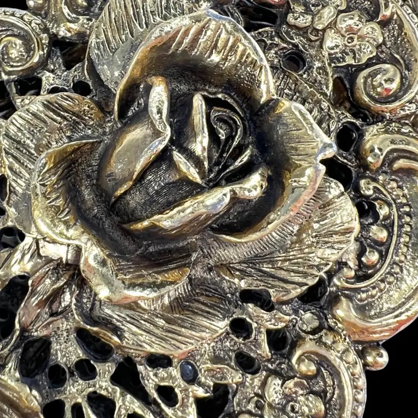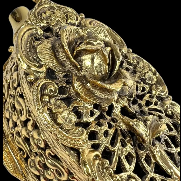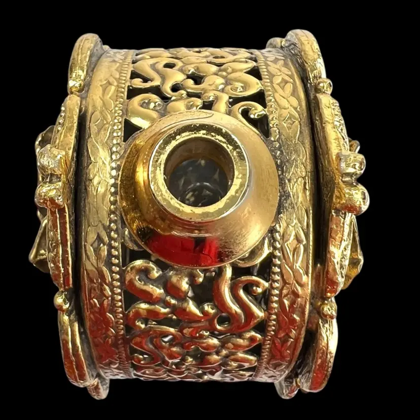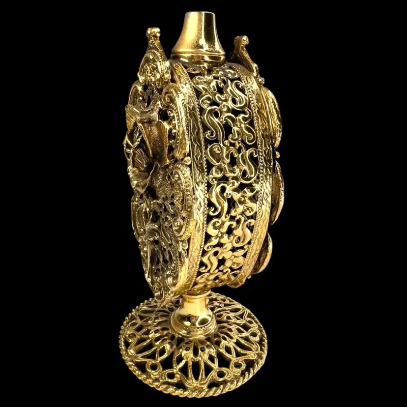 Incredible vanity piece! Unsigned, Vintage Rose Designs on Both Sides Glass vial intact inside (see last photo) No perfume dauber / dabber π’ Perfume Bottle in French Ormolu Technique - Ornate, Intricate, Gold Finishes, Heavy 18K Gold Gilded (acid tested) - Roses & Base & Front/Back. Non-magnet, so not a ferrous (iron) metal Sides too difficult to acid test but are magnetic, so they have a ferrous base metal. Weighs 14 ounces 6β H x 3β W x 3β D (base)