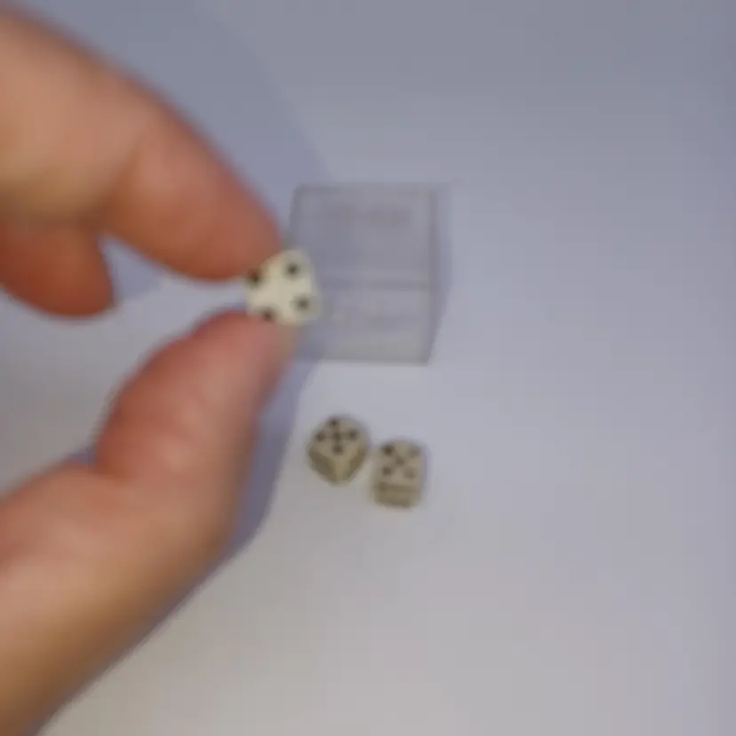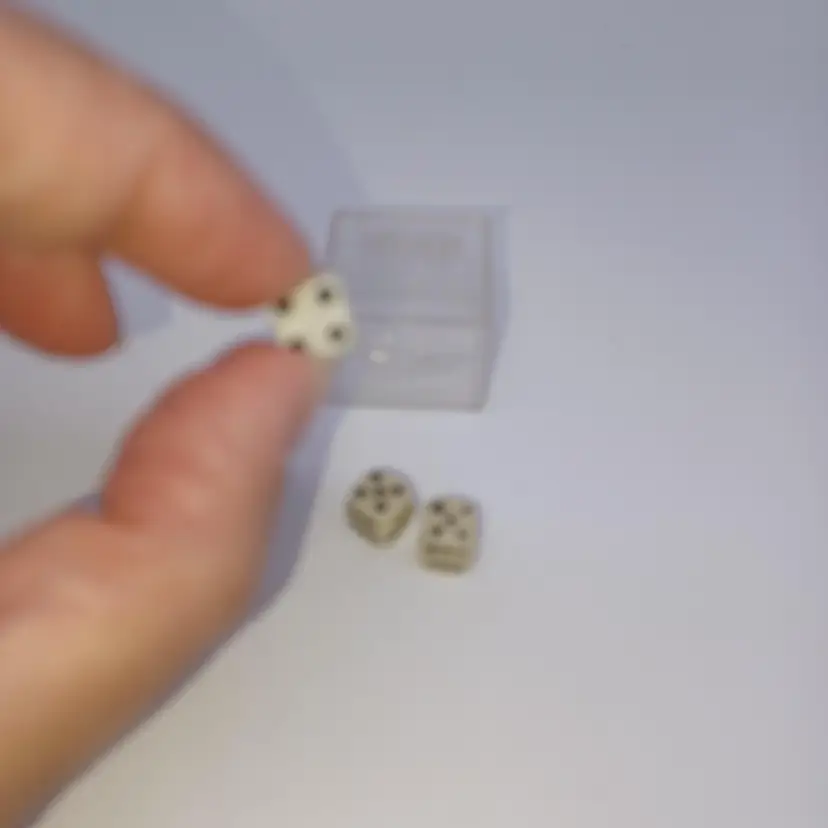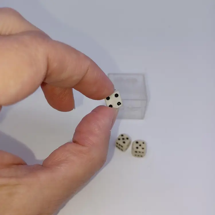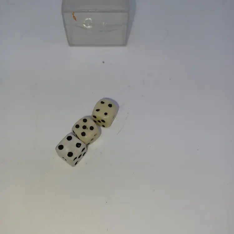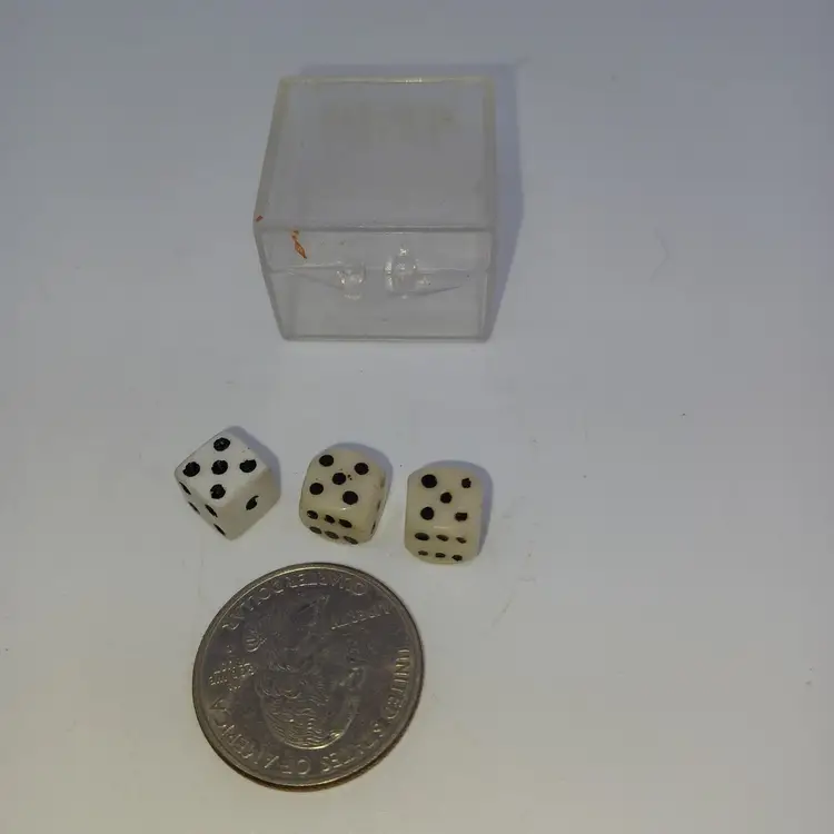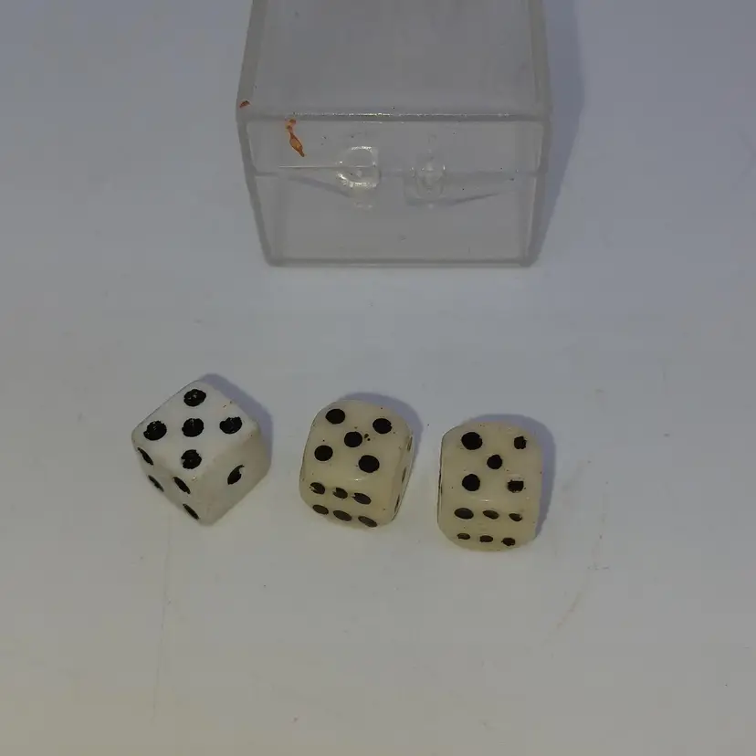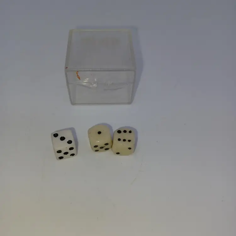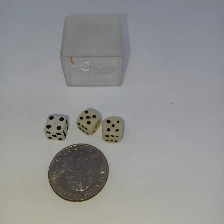 18th century miniature bone dice these 1/4 inch die are in very good shape two of them are definitely bone the whiter one I'm not quite sure of what it is composed of please see all pictures as they are the best description these are tiny unique and well cared for all items from a smoke-free home with pets experienced shipper this item will be mailed in a padded mailer to help you save on shipping