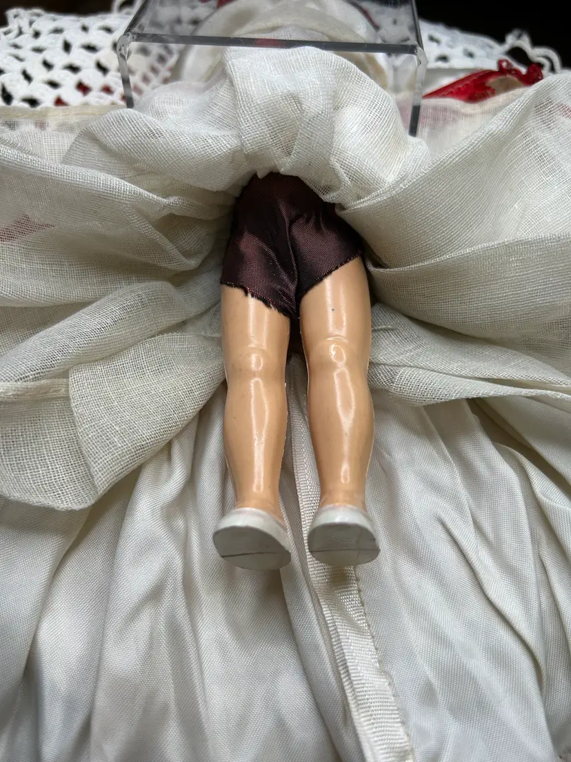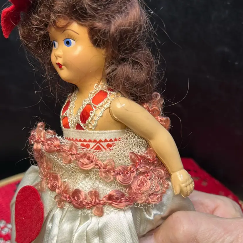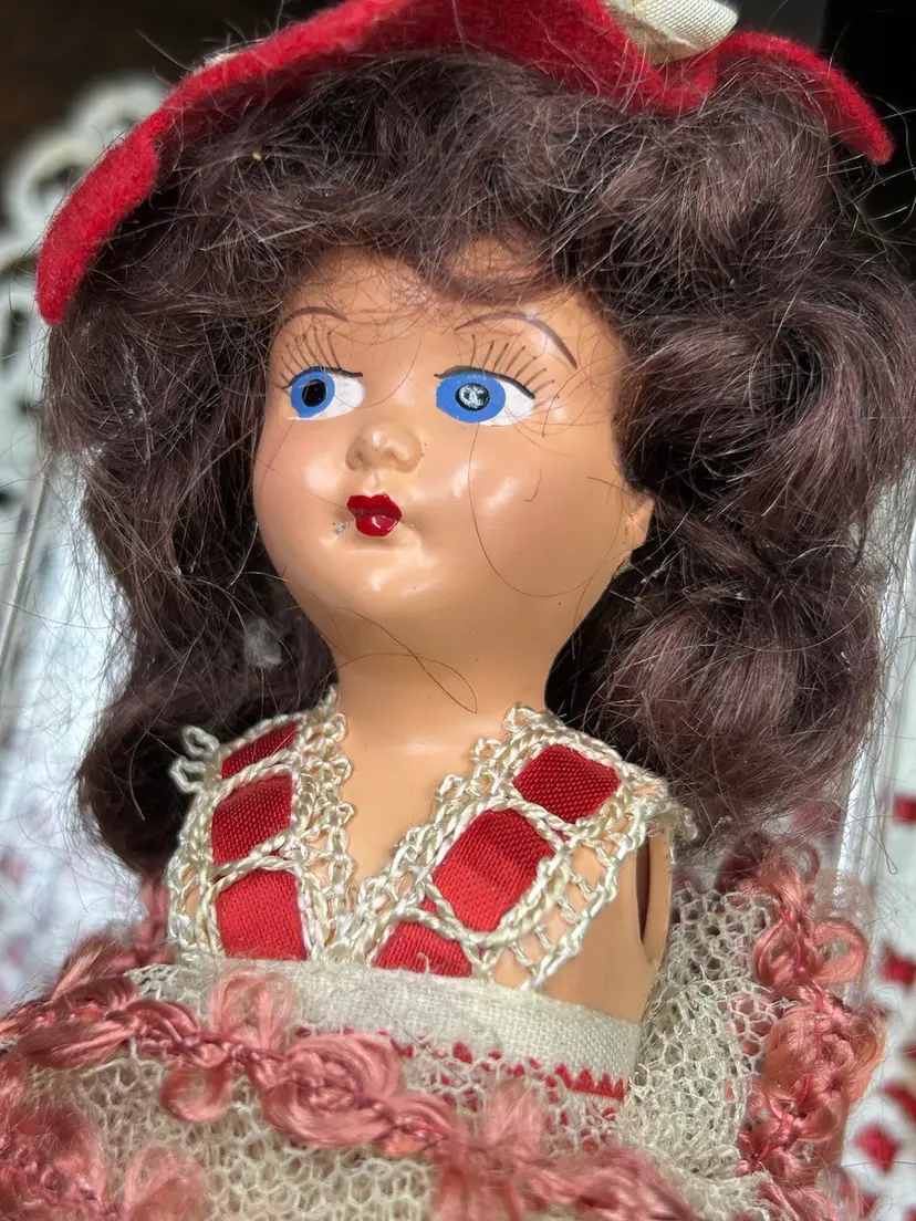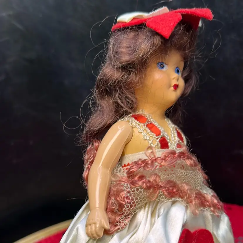 Brunette, hard plastic (celluloid?) head, body, and limbs. Very good condition. Face is perfect. Arms were detached but i reattached with a new rubber band. All original clothes and hat, still attached as when new.