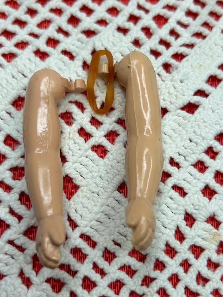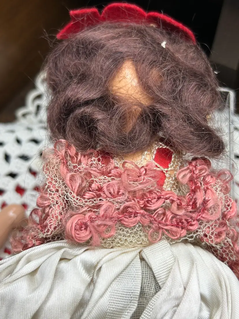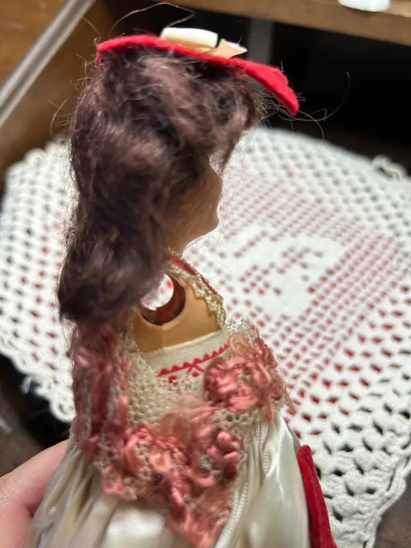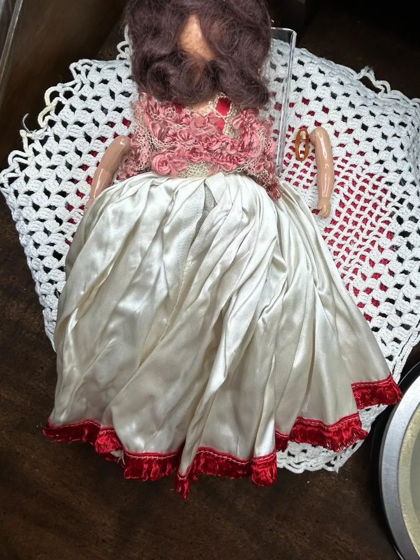 Brunette, hard plastic (celluloid?) head, body, and limbs. Very good condition. Face is perfect. Arms were detached but i reattached with a new rubber band. All original clothes and hat, still attached as when new.