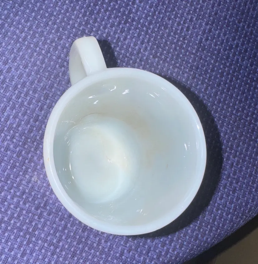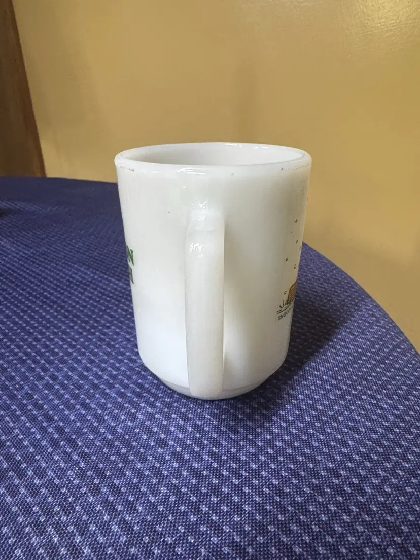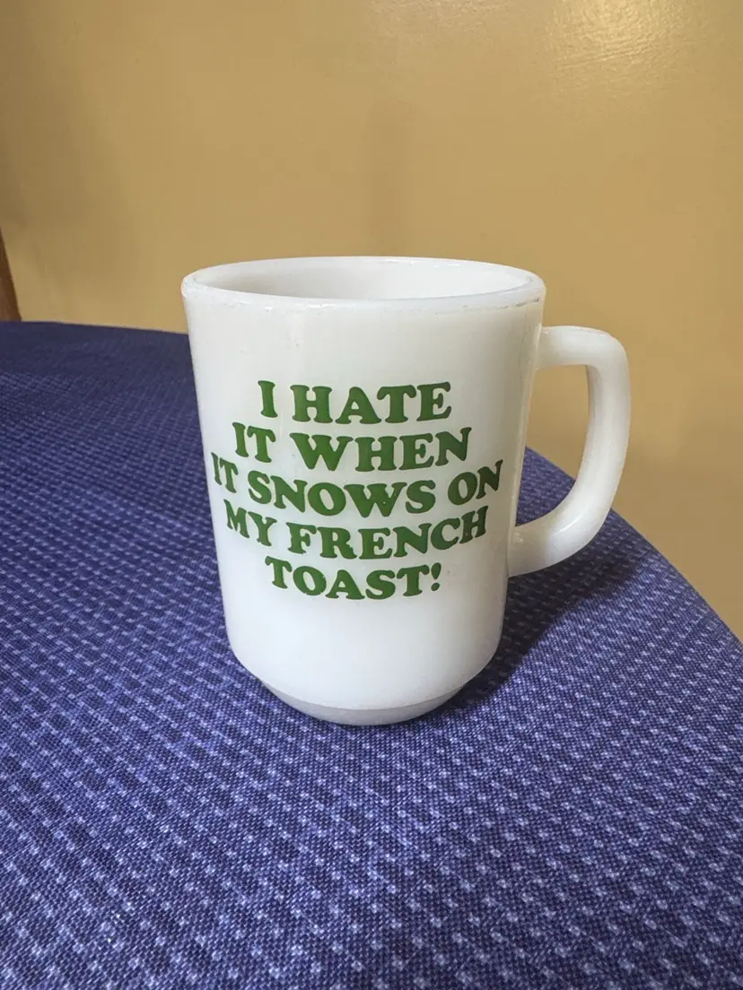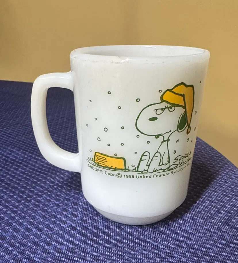 Enjoy your favorite beverage in this charming Snoopy mug. Featuring a playful design with Snoopy wearing a yellow hat, this white mug adds a touch of fun to your dining experience. 1958 Fire King SNOOPY Coffee Mug “I Hate It When It Snows On My French Toast” 4” tall 3” diameter Excellent condition with no breaks or chips there are some dark stains inside (1048930251)