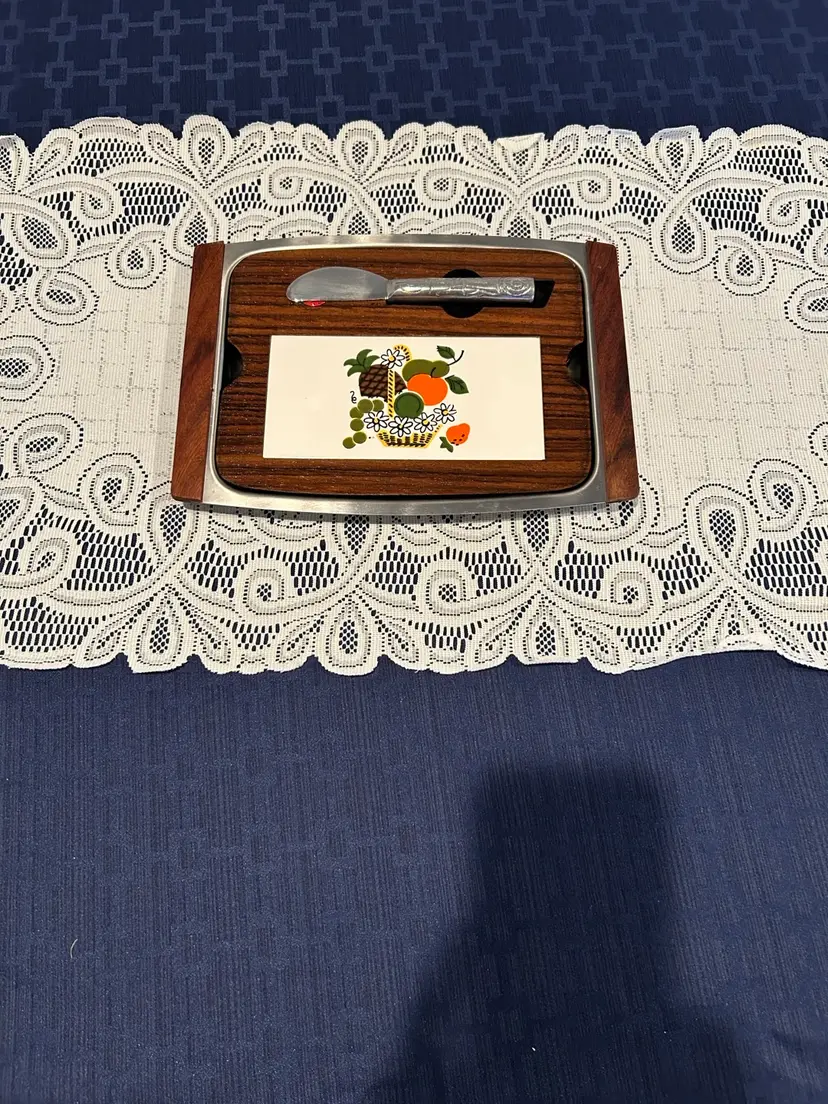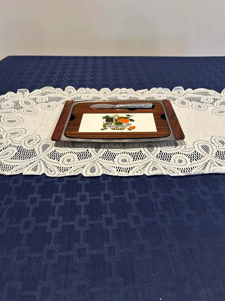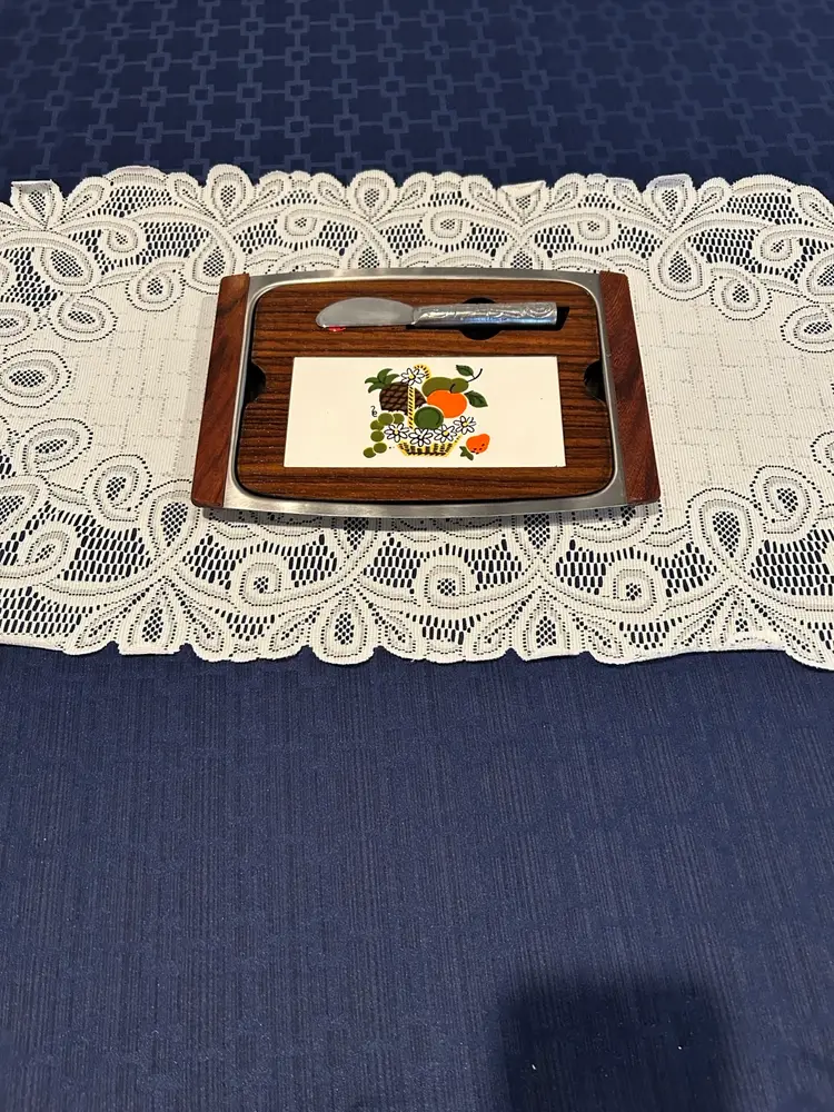 Enhance your dining experience with this elegant vintage wooden cheese board. Featuring a charming floral and fruit design, it adds a touch of nostalgia to your table. The included knife complements the board perfectly. Ideal for serving cheese and appetizers. Wt 2#.