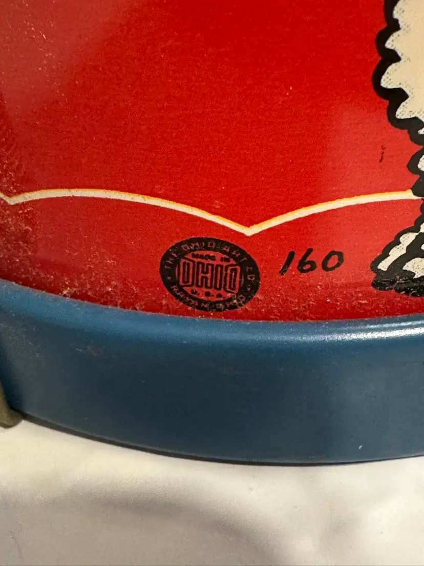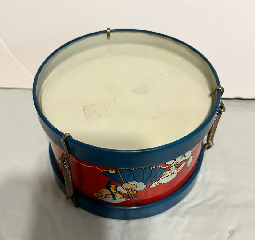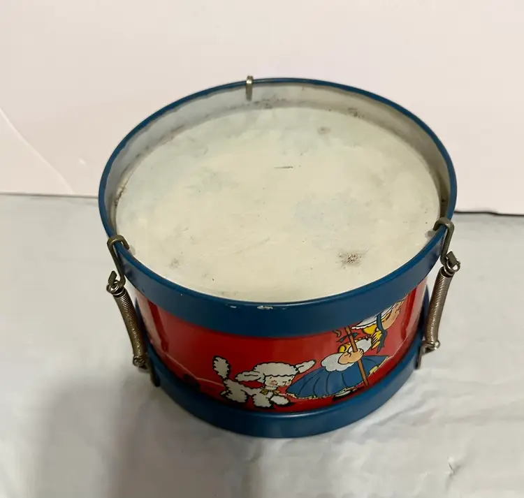 Cute vintage Ohio Art tin toy drum. It has nursery rhyme characters, Mary had a little lamb, BoPeep, a little boy with a pig. It measures a 6.25” x 4”. Condition is very good, very little wear on the top.