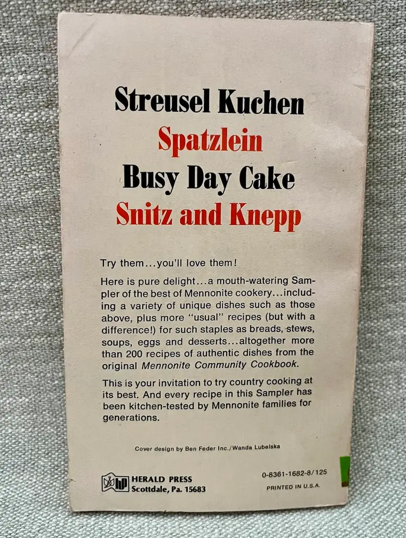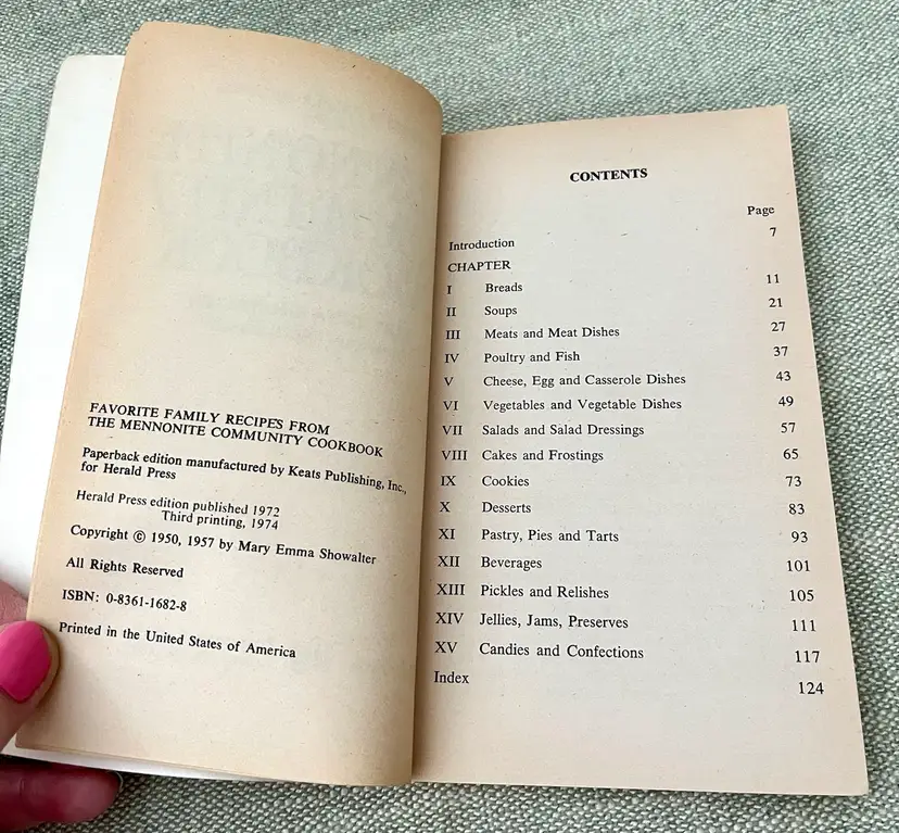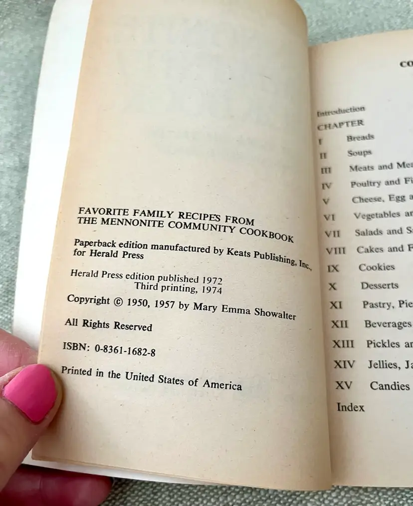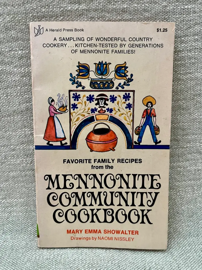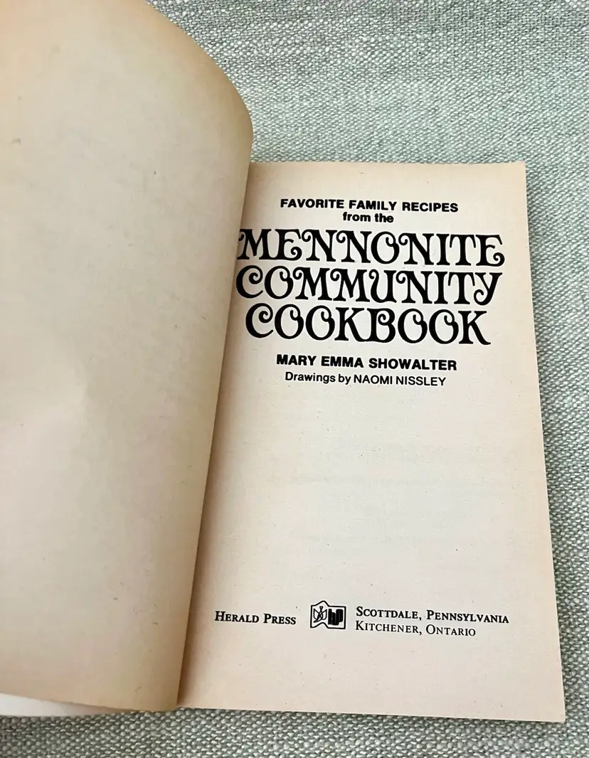 The 1974 3rd print “Favorite Family Recipes From the Mennonite Community Cookbook” is a vintage paperback book authored by Mary Emma Showalter. It features a collection of cooking recipes in English from the Mennonite community. The cookbook, with 128 pages, includes illustrations by Naomi Nissley and was published by Herald Press in the United States during the 1970s. This nonfiction narrative focuses on cooking and offers a glimpse into the food traditions and recipes of the Mennonite community.