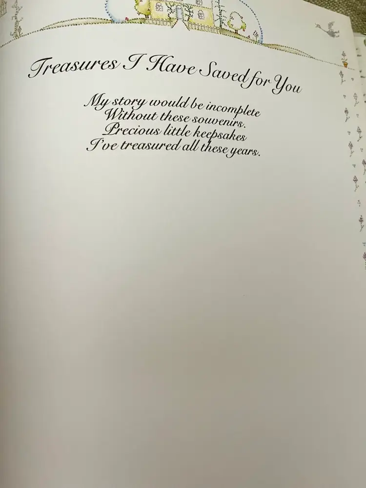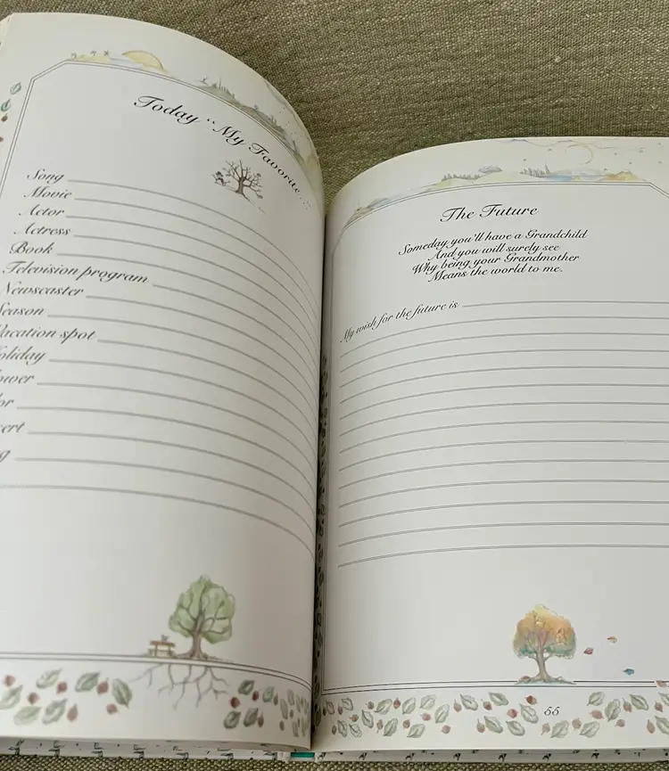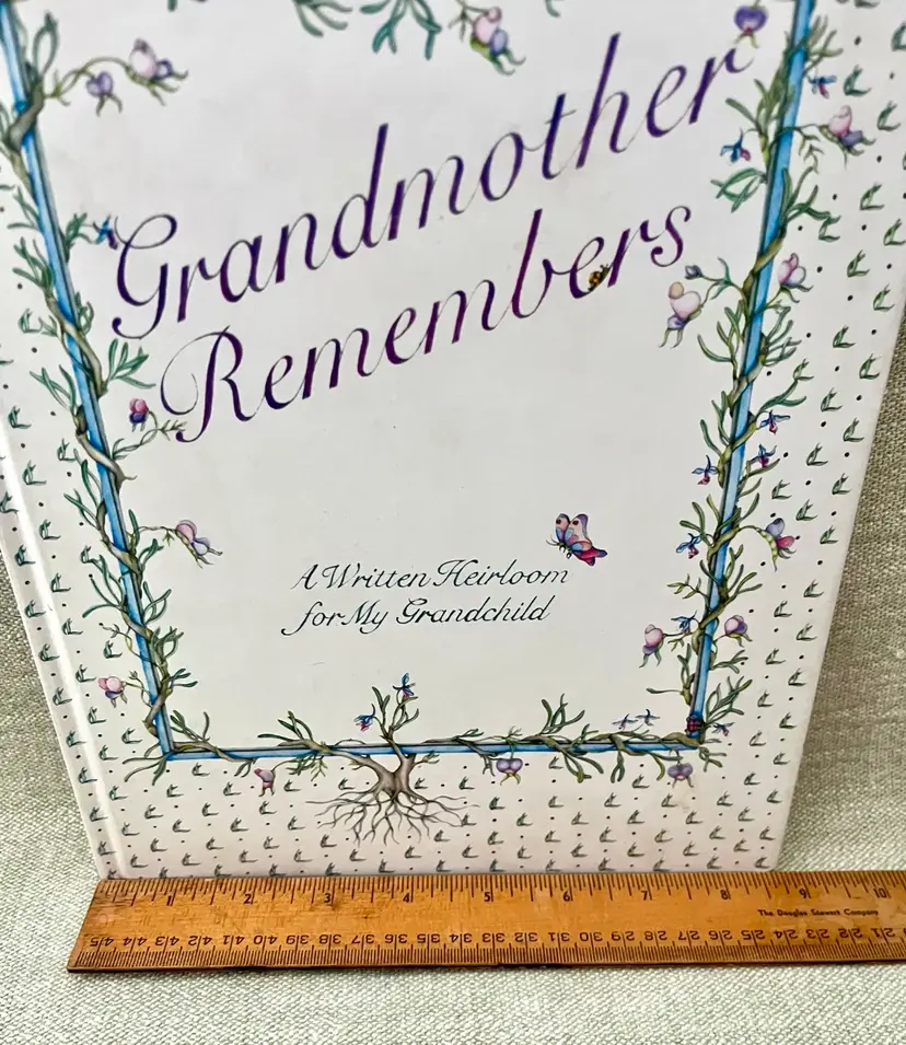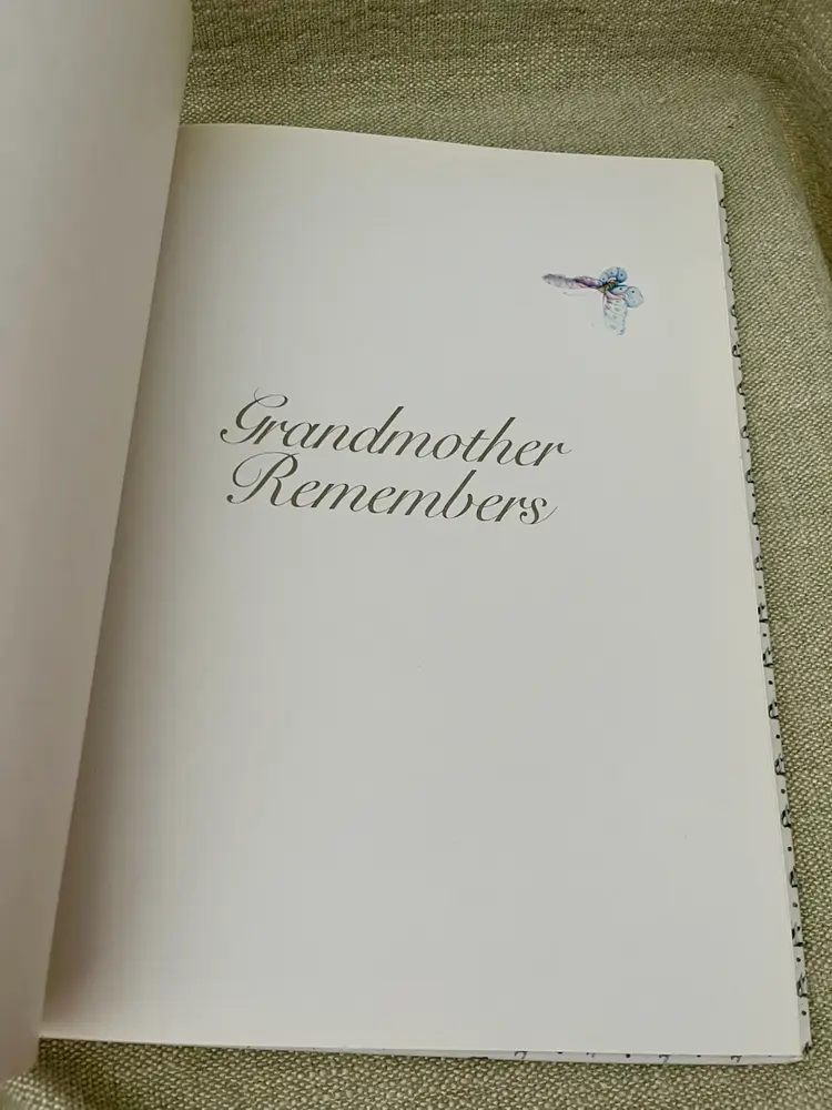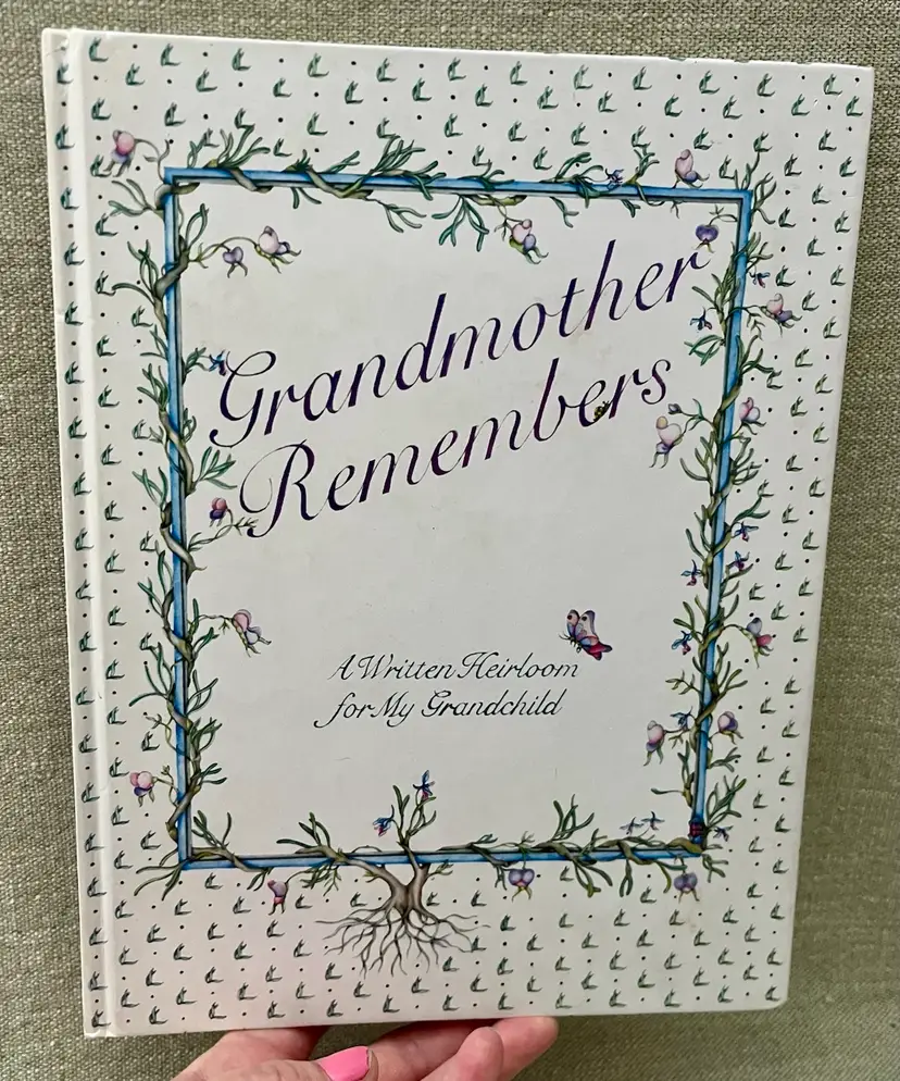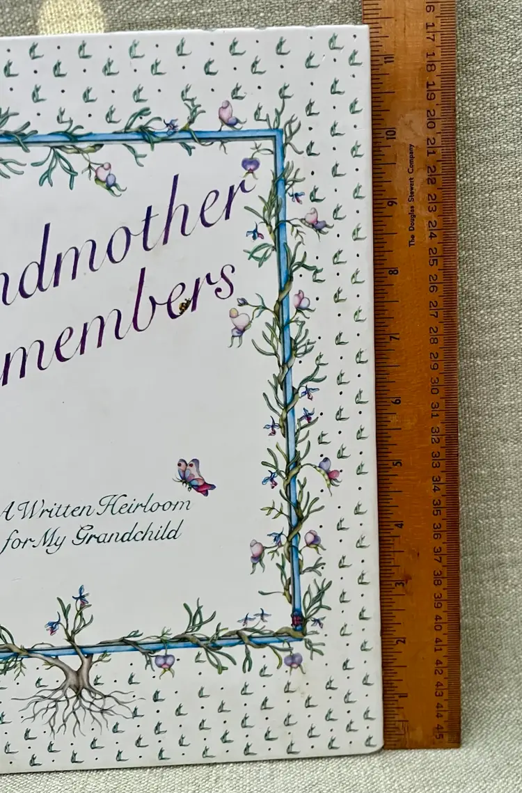 This is a 1983 Grandmother Remembers written heirloom for a grandchild, featuring a white and multi-color accent design. Here is an opportunity to capture the history and family genealogy of the grandchild's lineage, focused on preserving memories and storytelling. Originating from Japan, this unique keepsake is suitable for both baby boys and girls, making it a special and meaningful gift for any child.