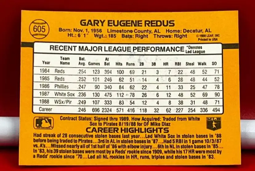 Hello, what we have is a Collector Trading Card by: Donruss. Year: 1989. Team: Pirates. Player: Gary Redus. Number: 605.