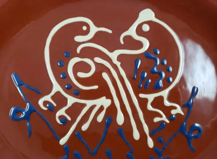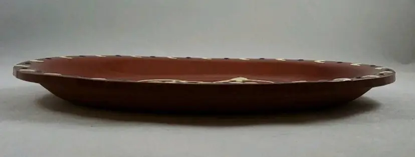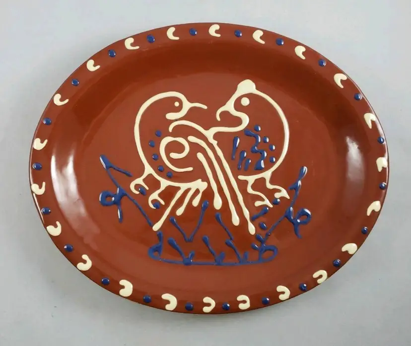 Unique, redware oval platter slip decorated in a brown base glaze and a Rooster and Hen in cream and blue. In excellent condition, no chips or cracks. Signed and dated on the bottom.