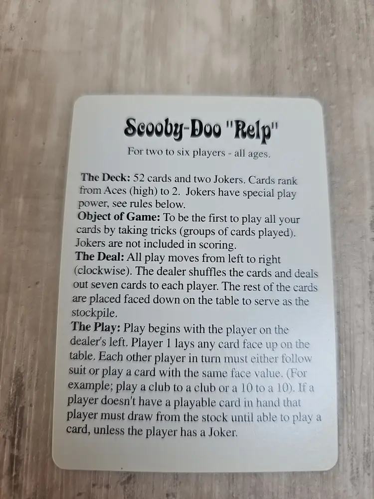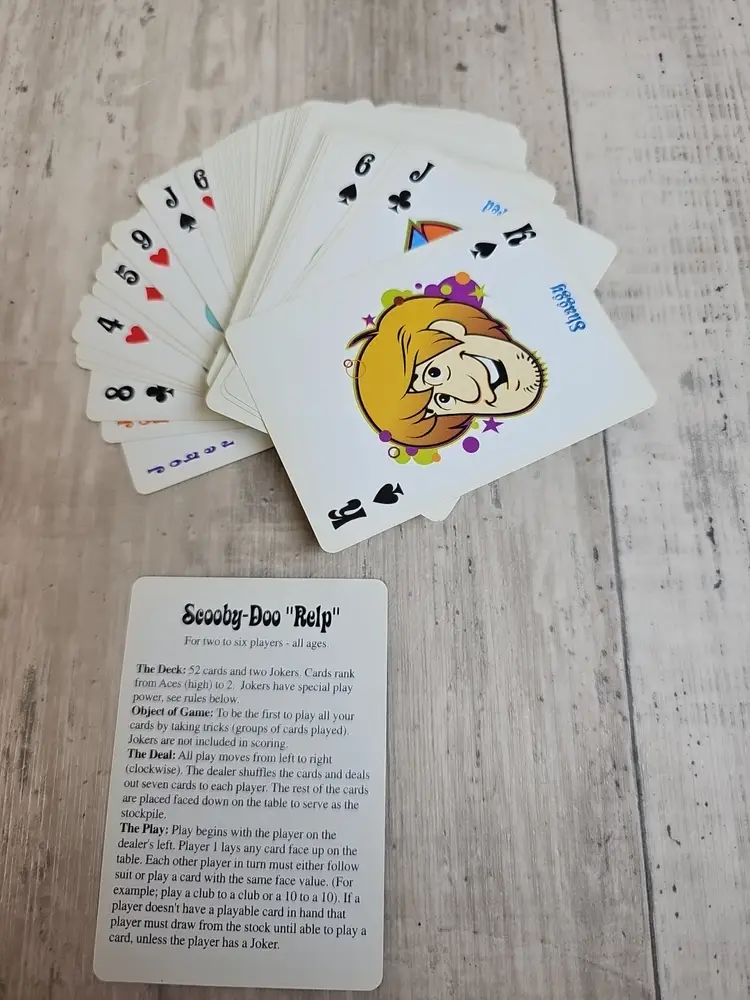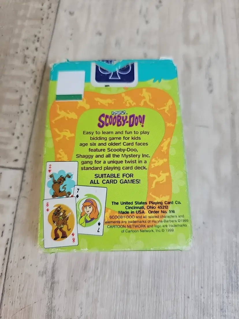 Original complete deck of Scooby-Doo playing cards from 1999. Includes jokers and instructions. Box has wear and a sticker on front. Cards are in excellent condition and depict the Mystery Inc. gang on face cards and jokers. Great for collectors or gameplay. Card Count is verified.