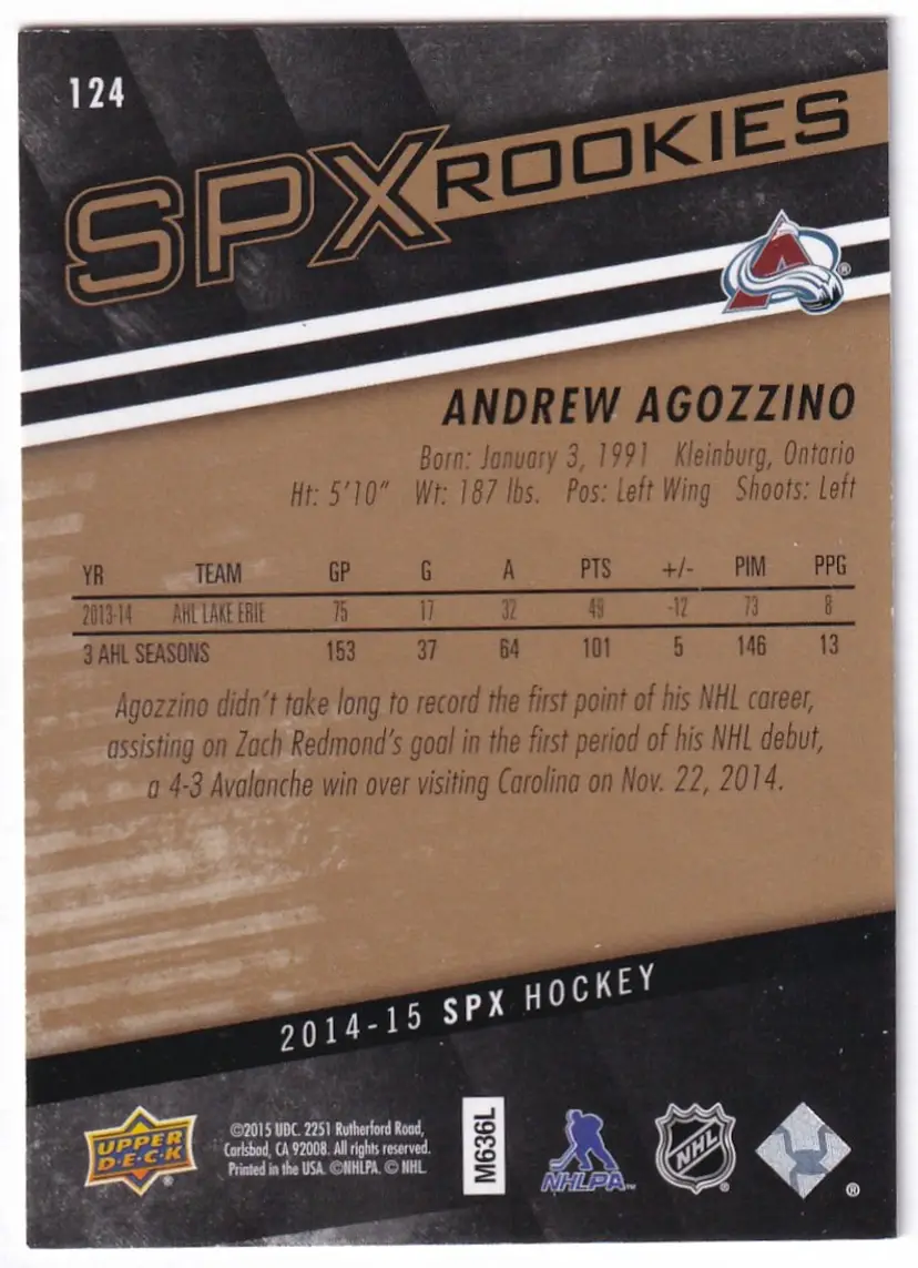 2014-15 SPx #124 Andrew Agozzino RC Colorado Avalanche