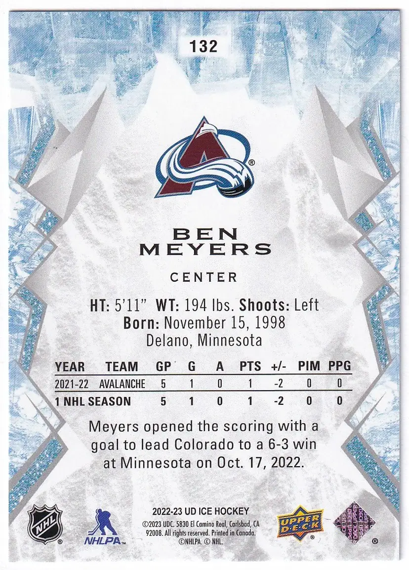 2022-23 Upper Deck Ice #132 Ben Meyers RC Colorado Avalanche