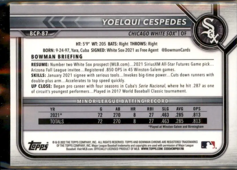 2022 Bowman - Chrome Prospects Atomic Refractors Yoelqui Cespedes - ( 138 ) - Chicago White Sox