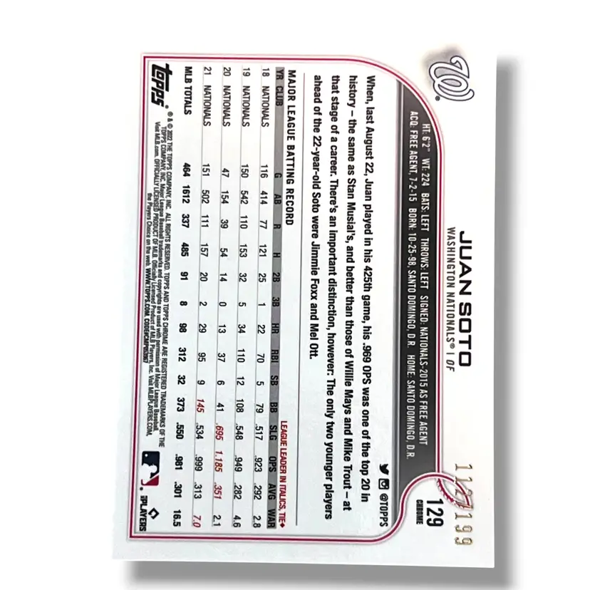 Here We Have a 2022 Topps Chrome Juan Soto Aqua Mini-Diamond Refractor 112/199 #129