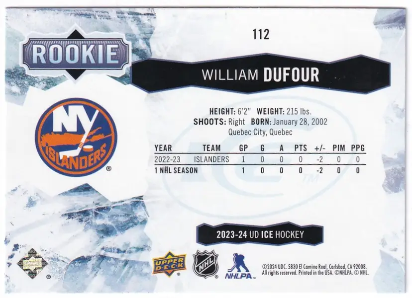 2023-24 Upper Deck Ice #112 William Dufour RC New York Islanders