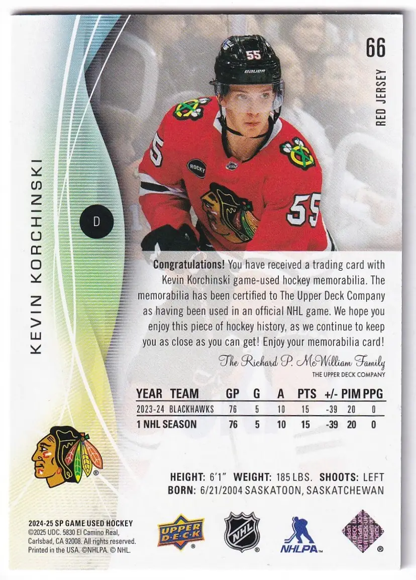 2024-25 SP Game Used Jerseys Red #66 Kevin Korchinski Chicago Blackhawks