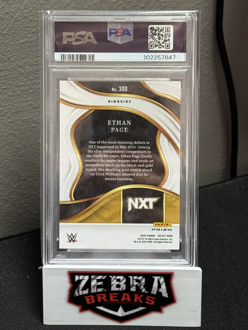 Elevate your wrestling card collection with the 2024 Panini Select WWE Ethan Page #300 Ringside Zebra Print card. This striking piece features the charismatic wrestler in mid-action, captured in the iconic Zebra Print parallel that fans and collectors alike covet. As part of the 2024 Panini Select series, this card represents a snapshot of Ethan Page's athletic prowess within the WWE universe. Crafted by renowned manufacturer Panini, this card is a testament to their commitment to quality and detail. It boasts a standard card size, ensuring it fits seamlessly with your existing collection. Whether you're a dedicated follower of WWE, NXT, or AEW, or simply an enthusiast of sports trading cards, this non-autographed piece is a noteworthy addition to any assortment.
