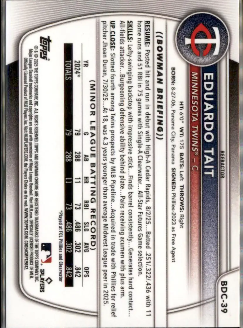 2025 Bowman Draft #BDC-39 Eduardo Tait Chrome Refractor - (138) - Minnesota Twins