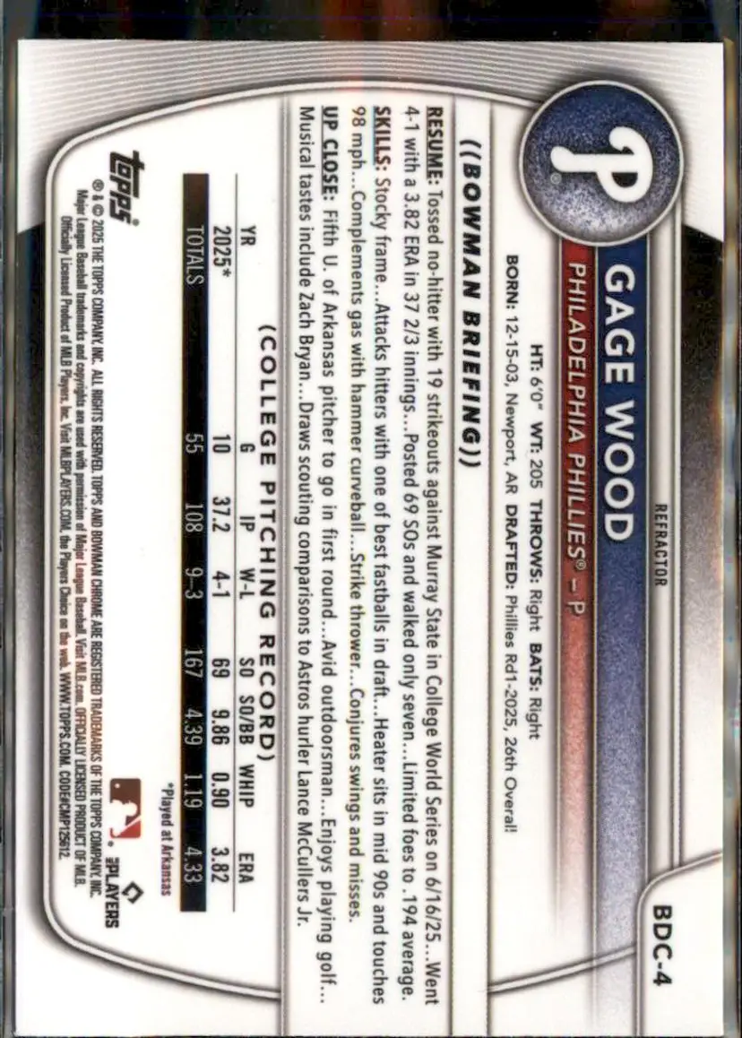 2025 Bowman Draft #BDC-4 Gage Wood Chrome Refractor - (138) - Philadelphia Phillies