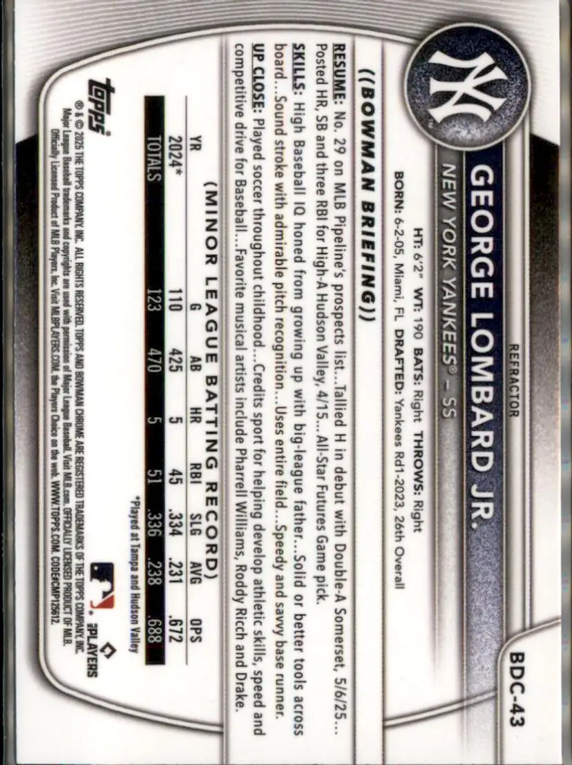 2025 Bowman Draft #BDC-43 George Lombard Jr. Chrome Refractor - (138) - New York Yankees