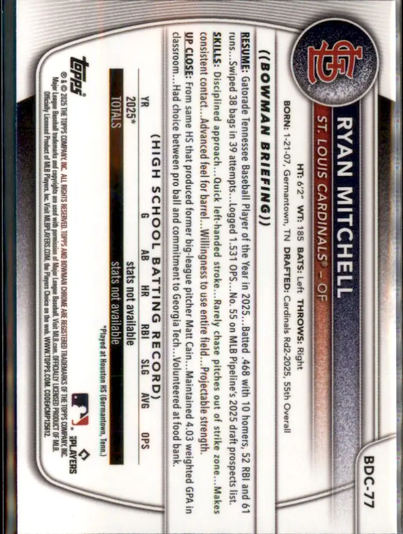 2025 Bowman Draft #BDC-77 Ryan Mitchell Chrome - (138) - St. Louis Cardinals