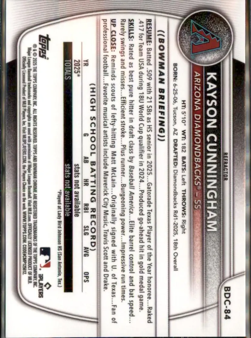 2025 Bowman Draft #BDC-84 Kayson Cunningham Chrome Refractor - (138) - Arizona Diamondbacks